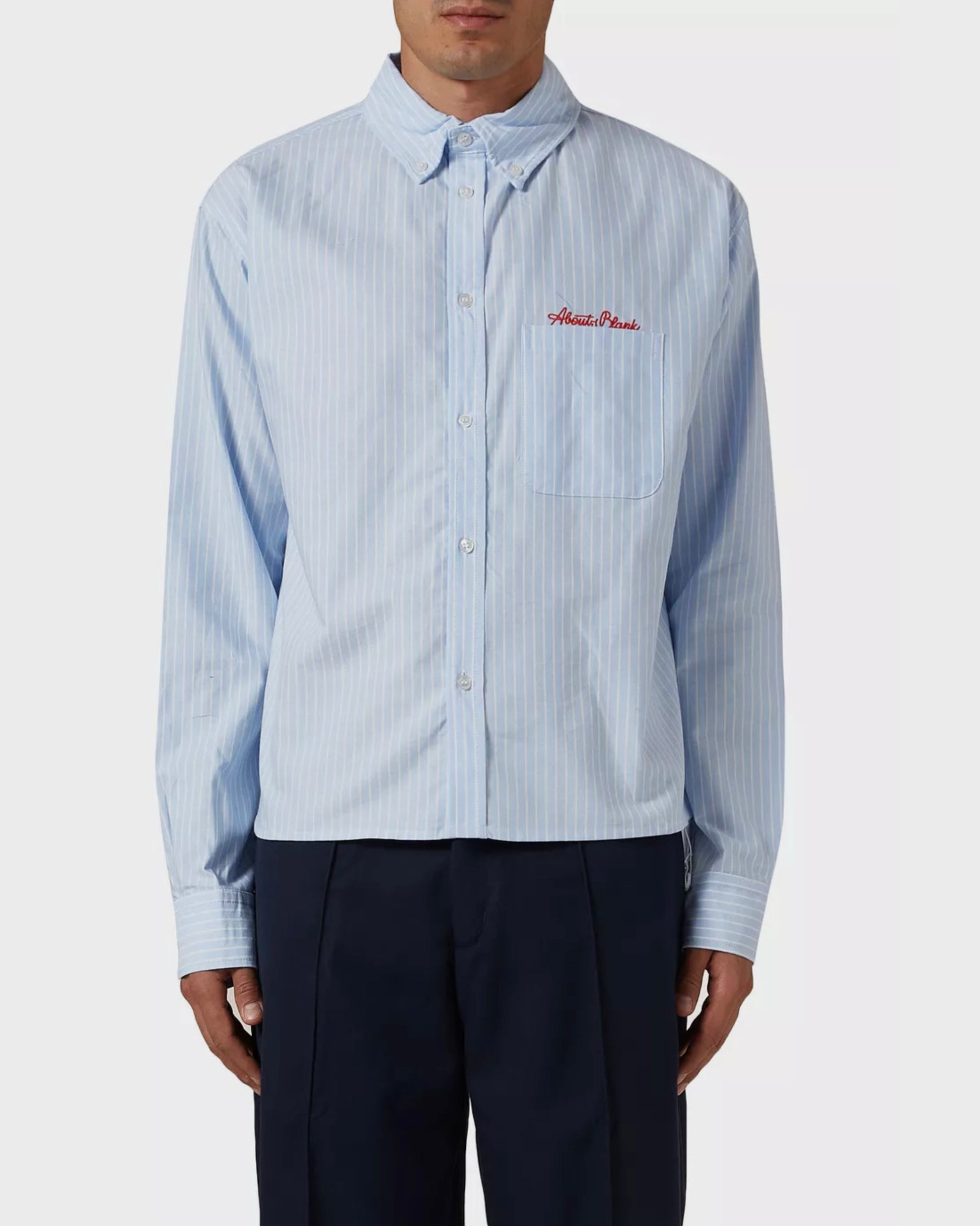 A minimal uniform for the streets. The About-Blank Script Logo Shirt reworks the classic pinstripe with a cropped cut and subtle box fit. Finished with red script embroidery at the chest — an understated nod to rebellion in a corporate silhouette.