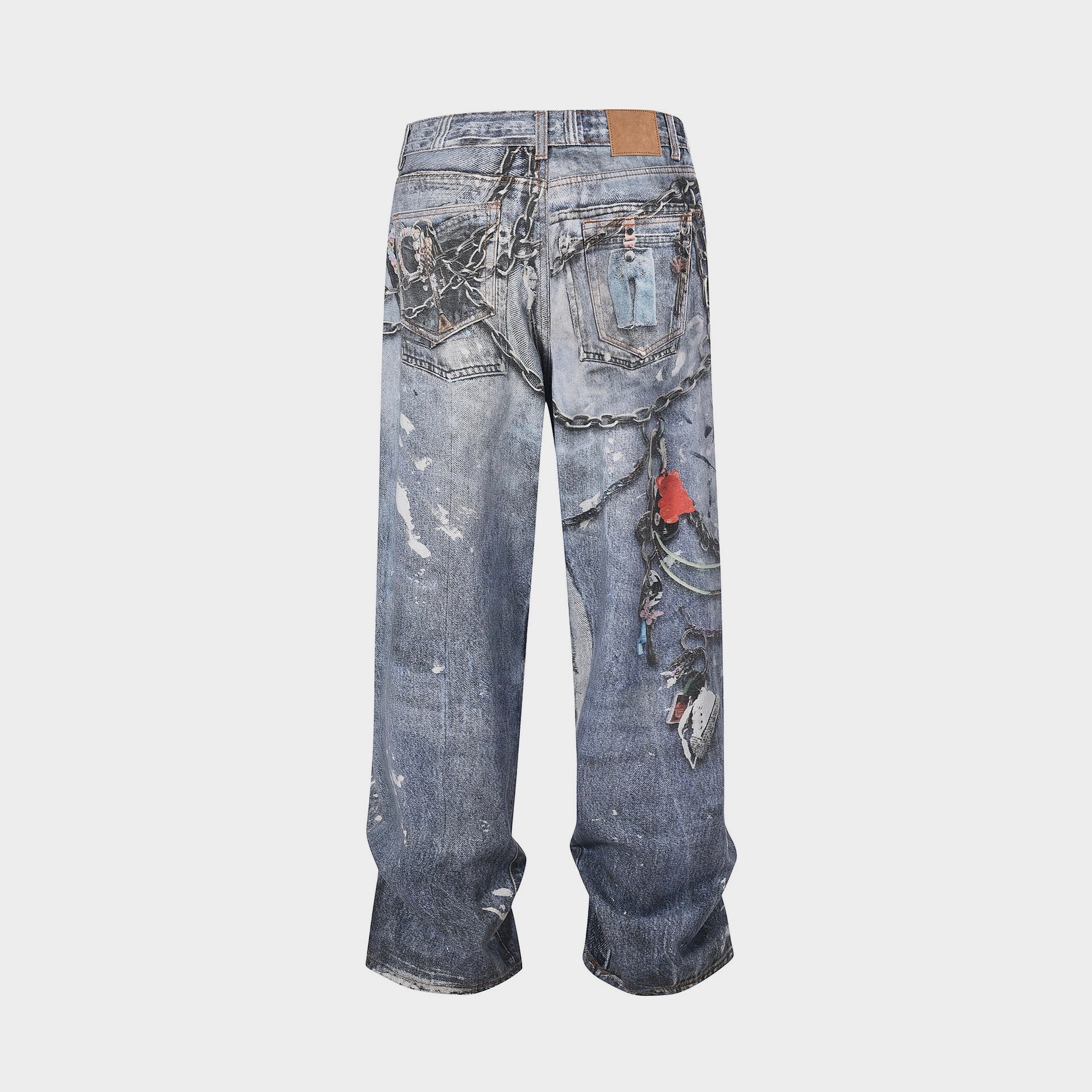 1981 trousers are cut to a loose fit with a low waist, wide leg and long length. Made of cotton canvas fabric base with a seasonal trompe l'oeil optical illusion 'keychains' print with an ink jet pigment and a dirty mineral tint.