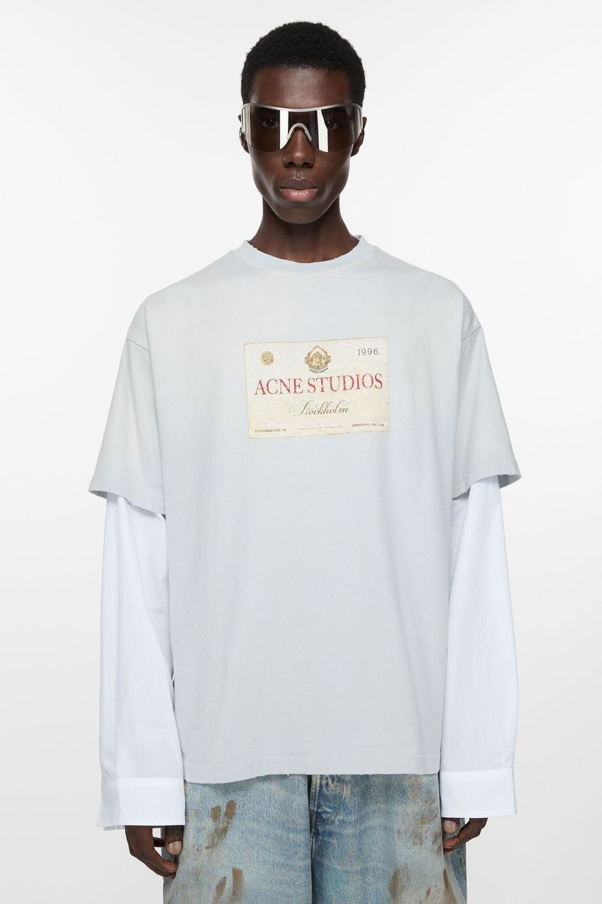 The ACNE STUDIOS Double-sleeve Print Shirt is a standout piece that merges grunge-inspired aesthetics with contemporary design. Crafted from 100% organic cotton, this light grey tee features a relaxed, oversized fit and is detailed with under-layer mesh long sleeves, giving the illusion of a layered look. Distressed elements at the neckline, cuffs, and hem add a raw, deconstructed feel, while a seasonal graphic print adorns the center front, encapsulating Acne Studios' avant-garde approach to fashion.