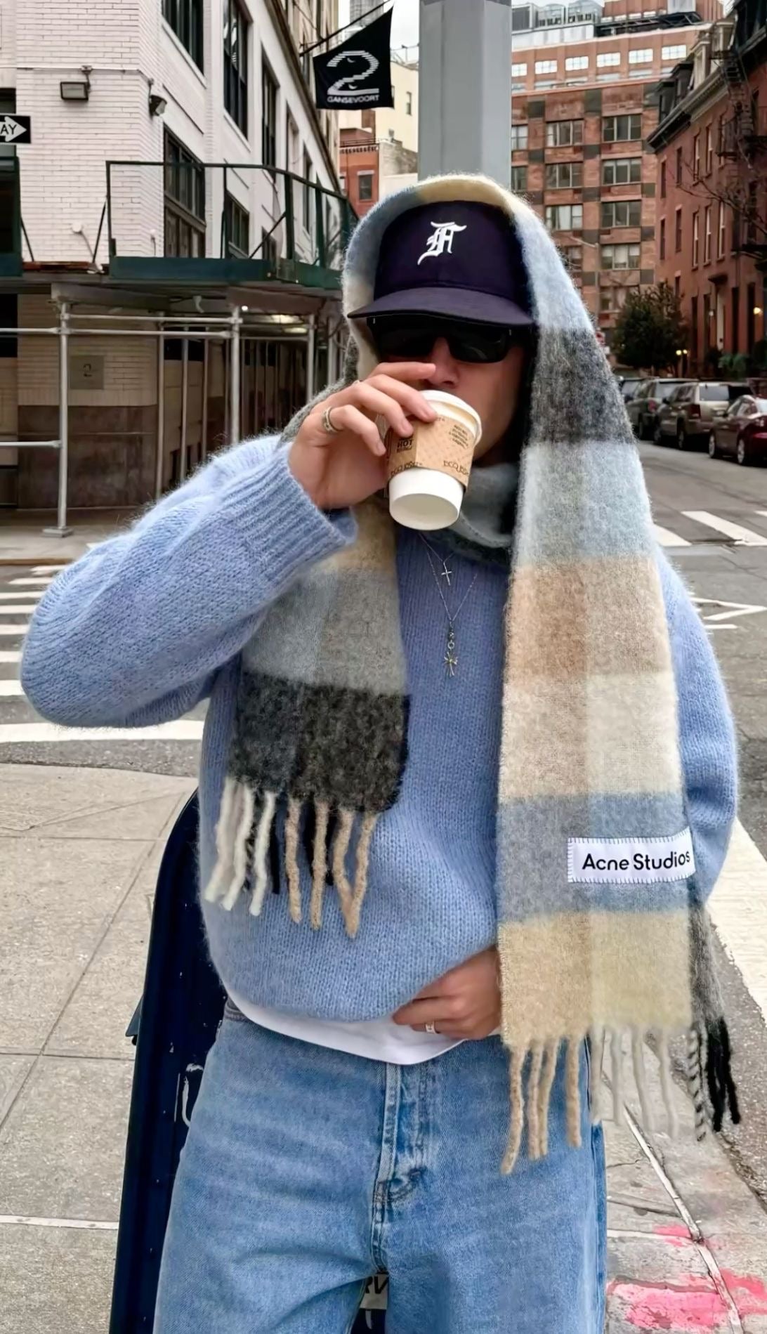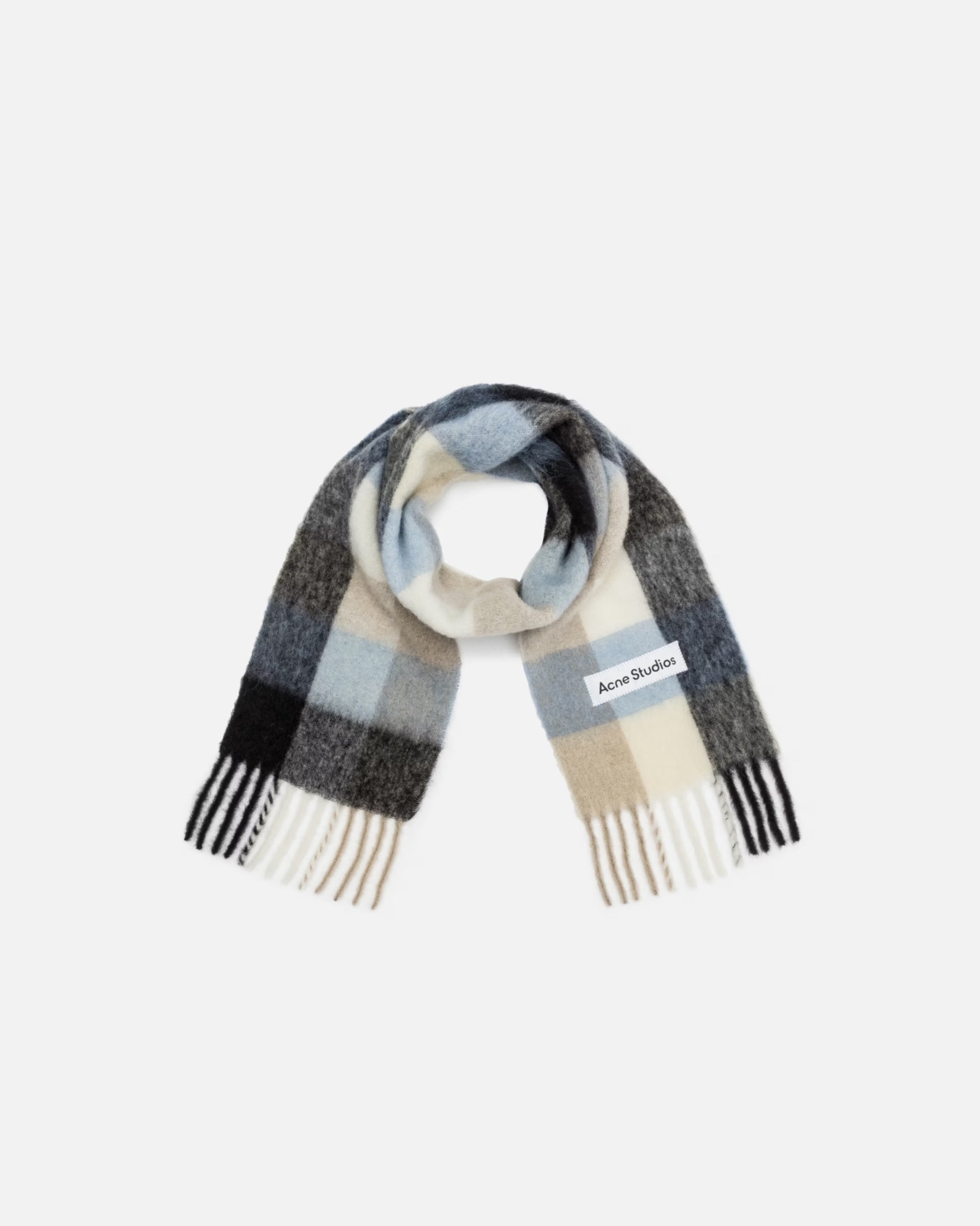 This oversized mohair-blend scarf features a soft brushed texture, subtle fringing, and a gradient checkered pattern that merges cream, black, grey, and sky blue tones making it a versatile layering piece for elevated winter styling.