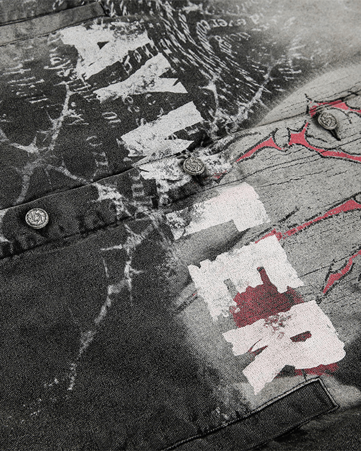 Across the body, fragmented typography collides with fractured webbing and a bleeding eye motif — a print that feels raw, unfinished, and intentionally imperfect. Every detail carries a sense of disruption, making the piece feel more like an artifact than clothing.