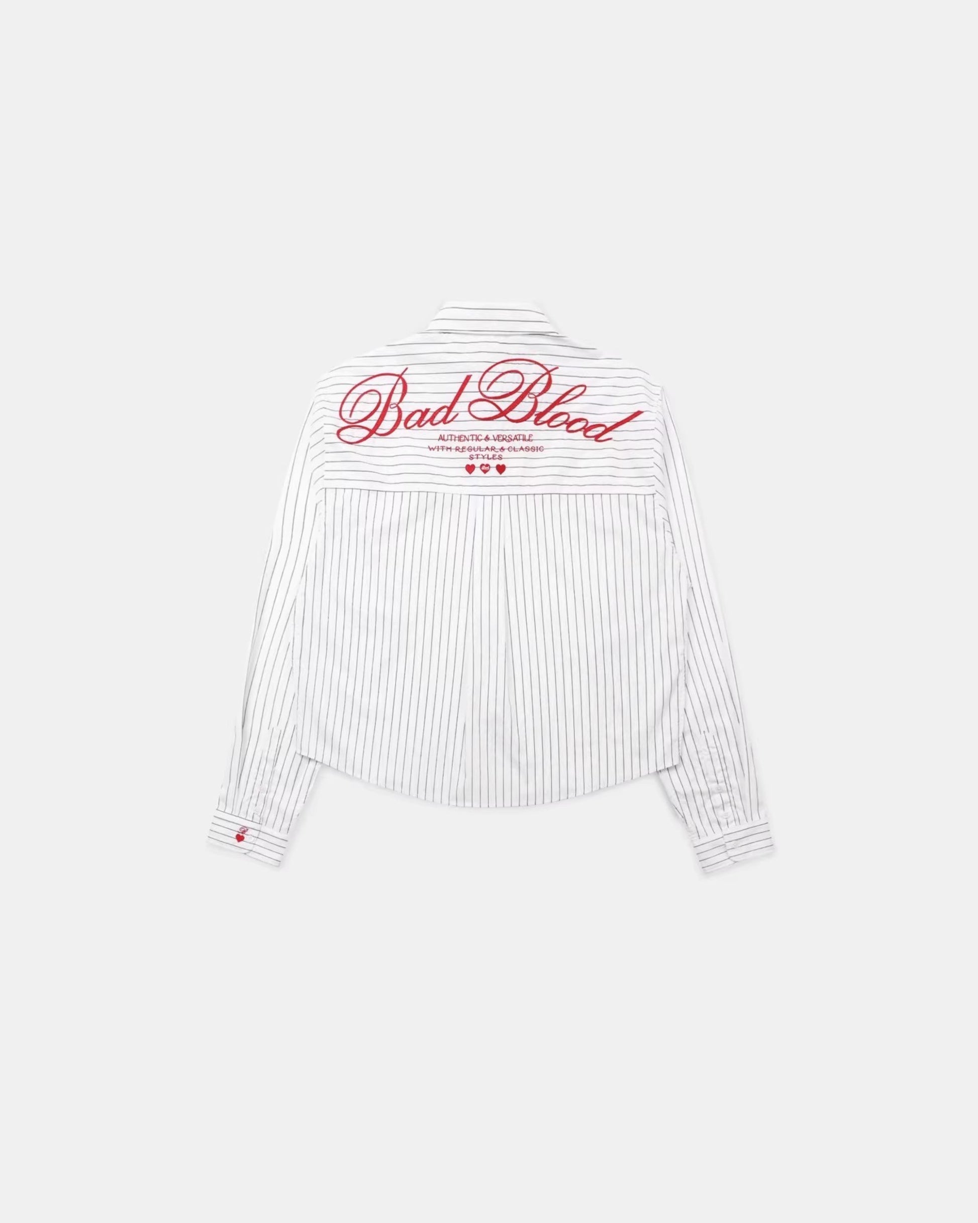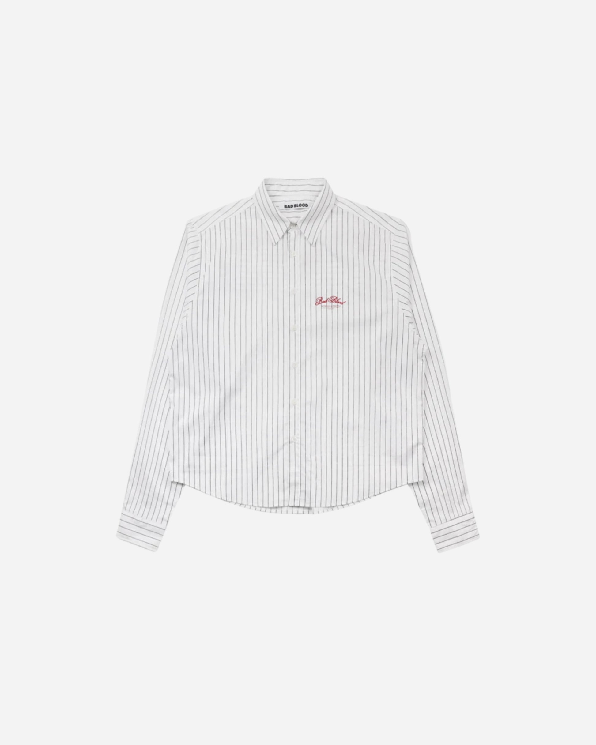 The Bad Blood Studios Stripe Shirt reworks a timeless pinstripe silhouette with bold character and subtle rebellion. Crafted in crisp white cotton with fine black stripes, the shirt features a relaxed, slightly boxy cut that drapes effortlessly on the body—easy, intentional, and understated.