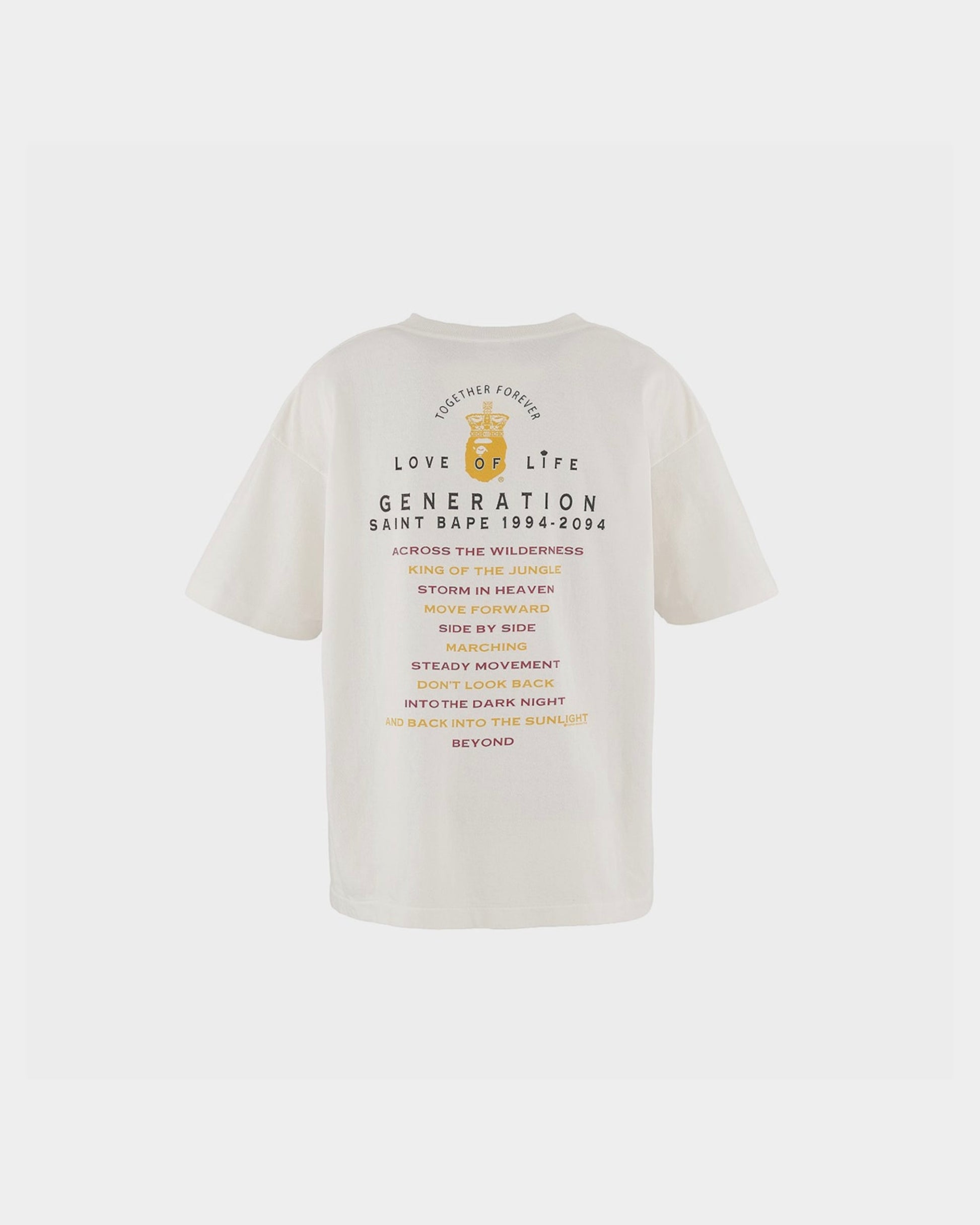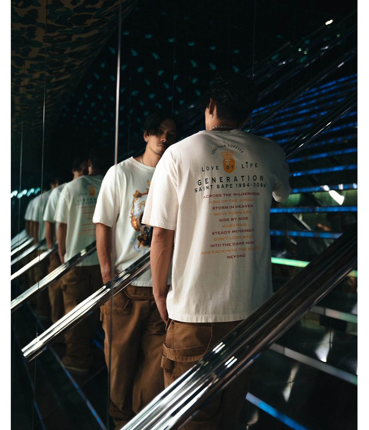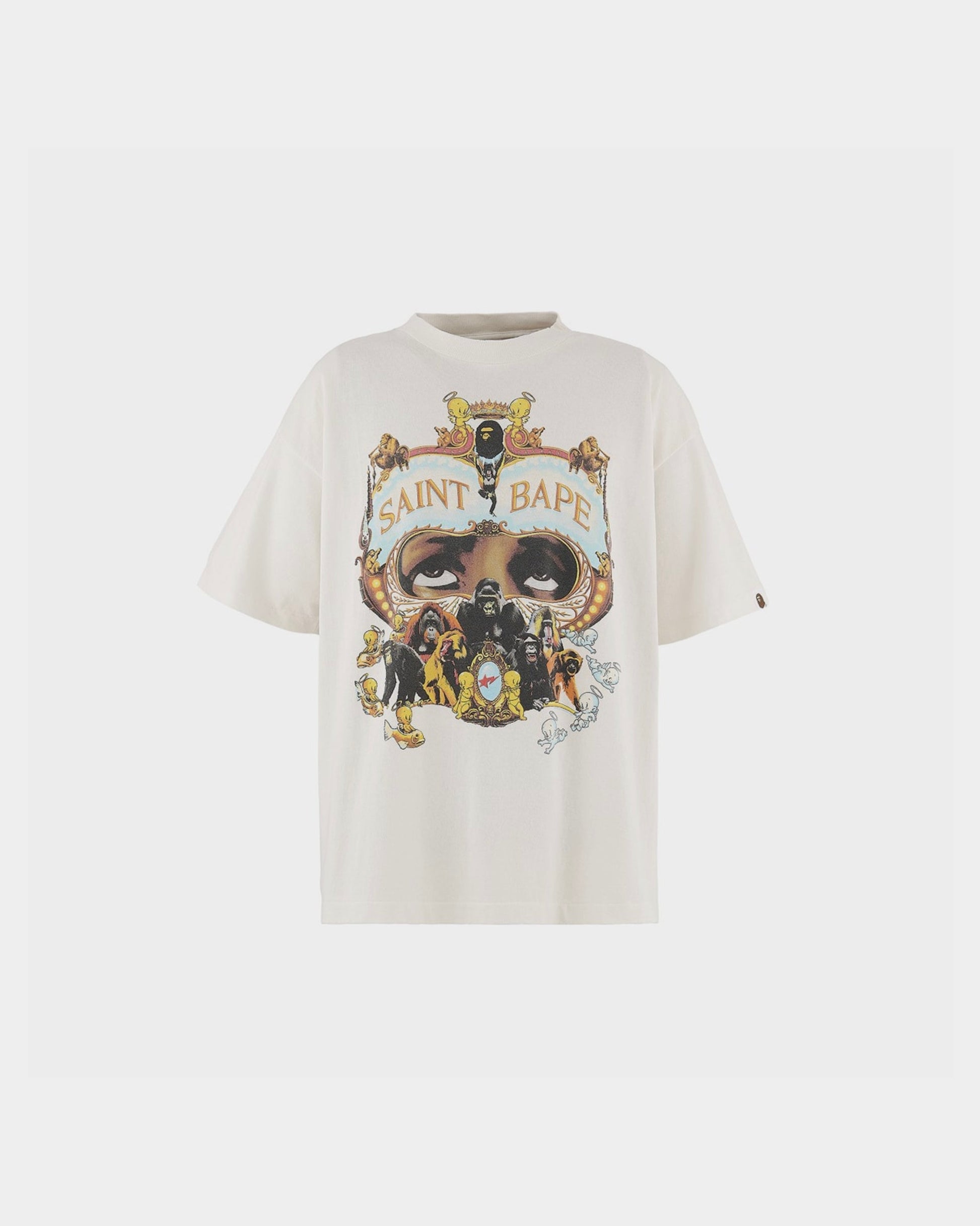 • Front: Oversized multicolor artwork featuring the “Saint Bape” narrative, with detailed characters and motifs that channel strength, rebellion, and unity.