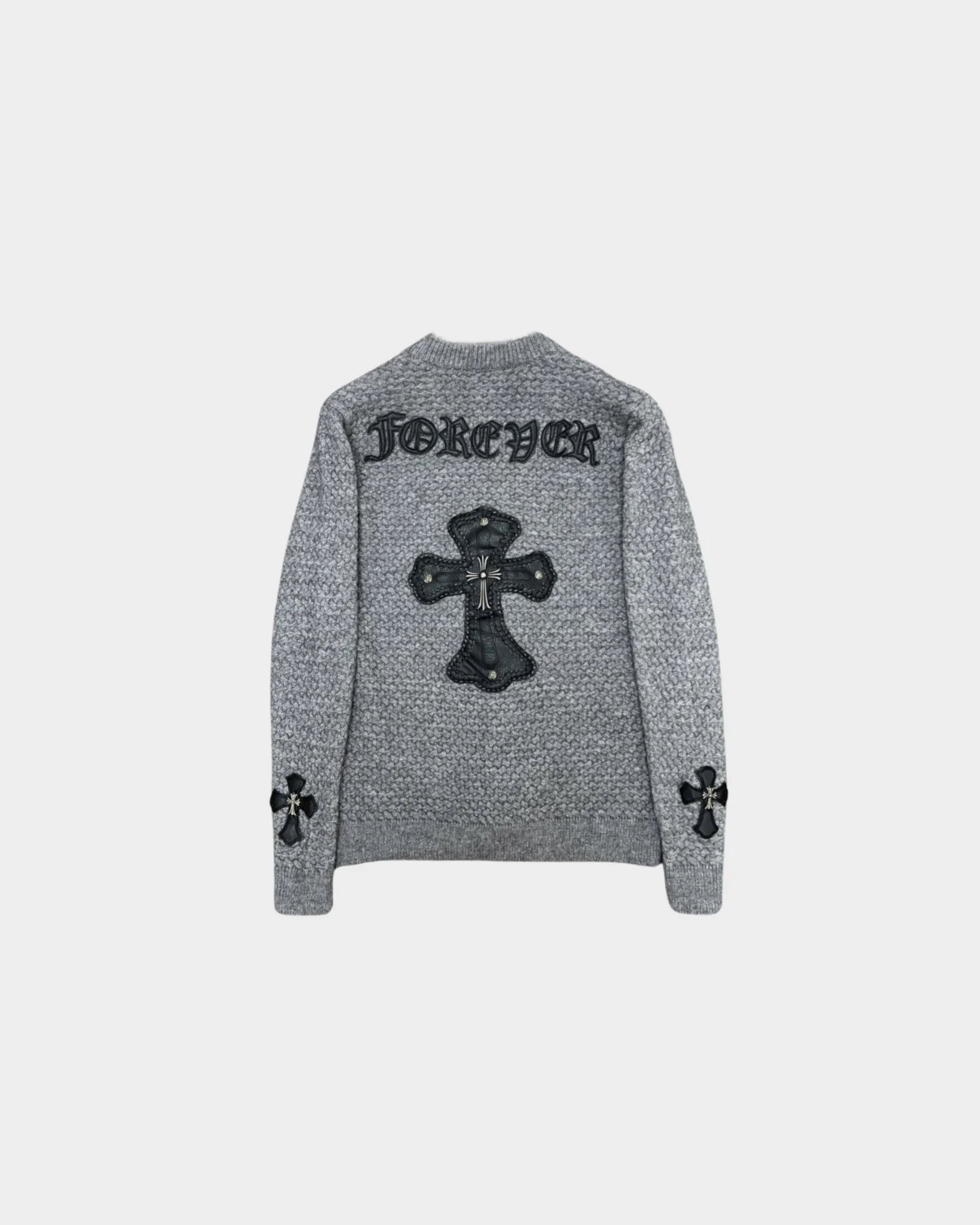 Rare archive-inspired knit pullover featuring bold gothic cross detailing and tonal embroidery on premium grey melange knit. A Vault-exclusive piece for elevated streetwear layering. Limited stock — once sold out, won’t restock.