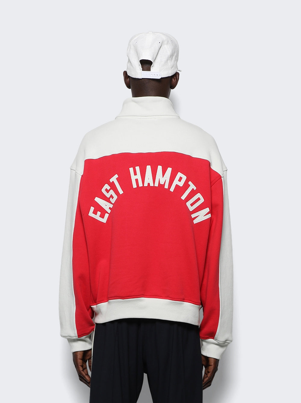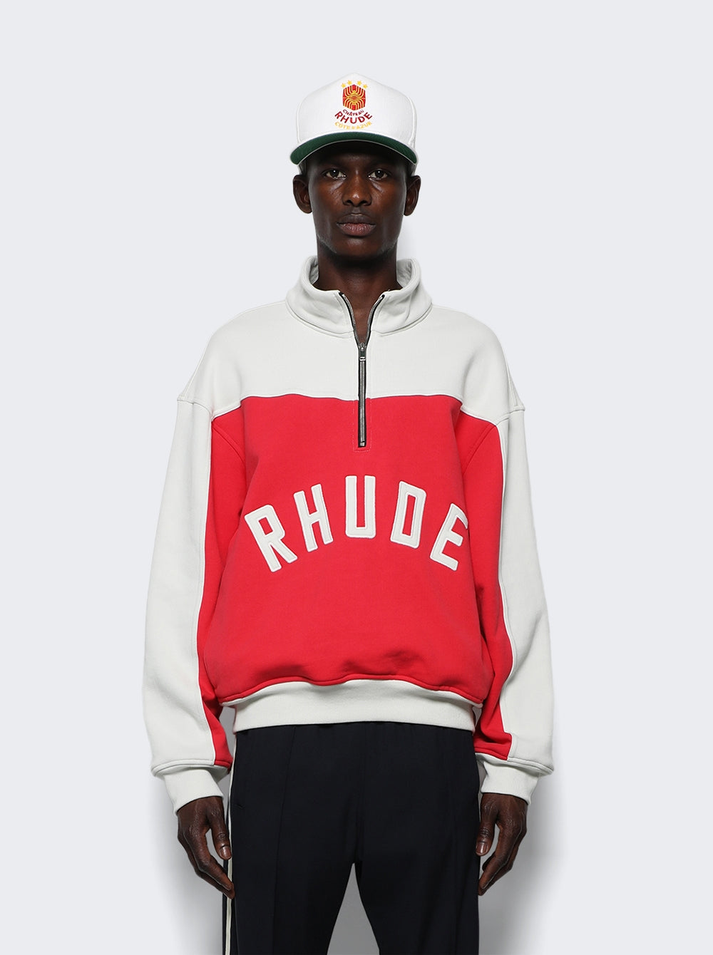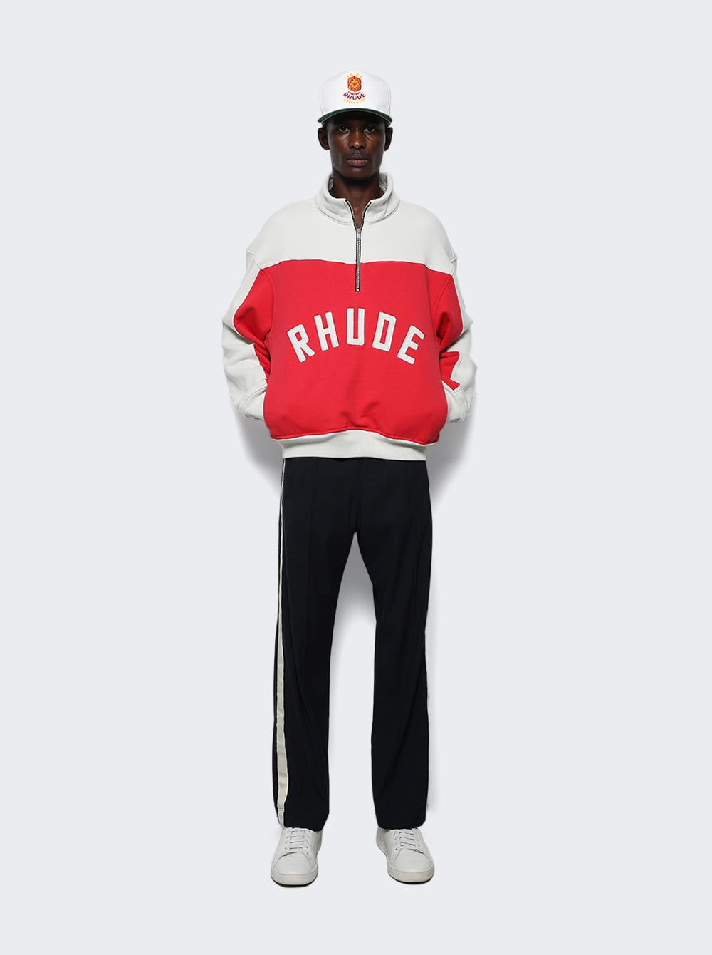 A bold fusion of retro sport style and modern streetwear. This quarter-zip track jacket features R-hude’s signature colorblock design in striking red and white, finished with oversized branding across the chest. Crafted from a premium cotton-blend for comfort and durability, it’s built with a relaxed fit, elasticated cuffs and hem, and a high-neck zip for versatile styling. Whether layered over a tee or worn solo, it delivers effortless statement energy on and off the streets.