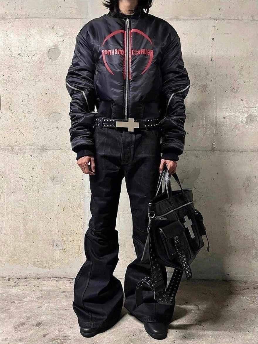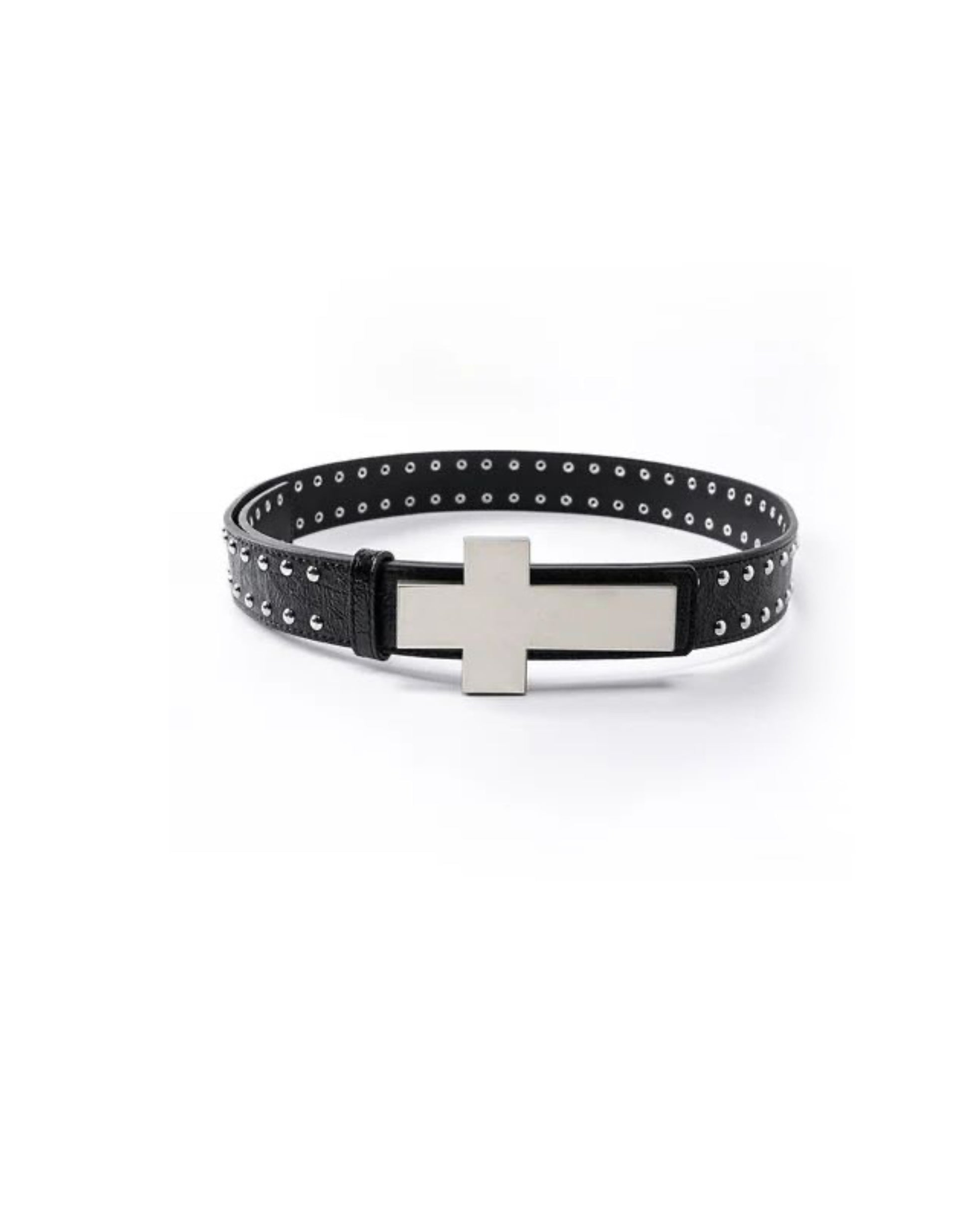 Crafted from textured black leather and detailed with precision-set metal studs, this belt is anchored by a bold cross buckle — minimal, but impossible to ignore. It’s the kind of piece that doesn’t try too hard, yet defines the entire fit.