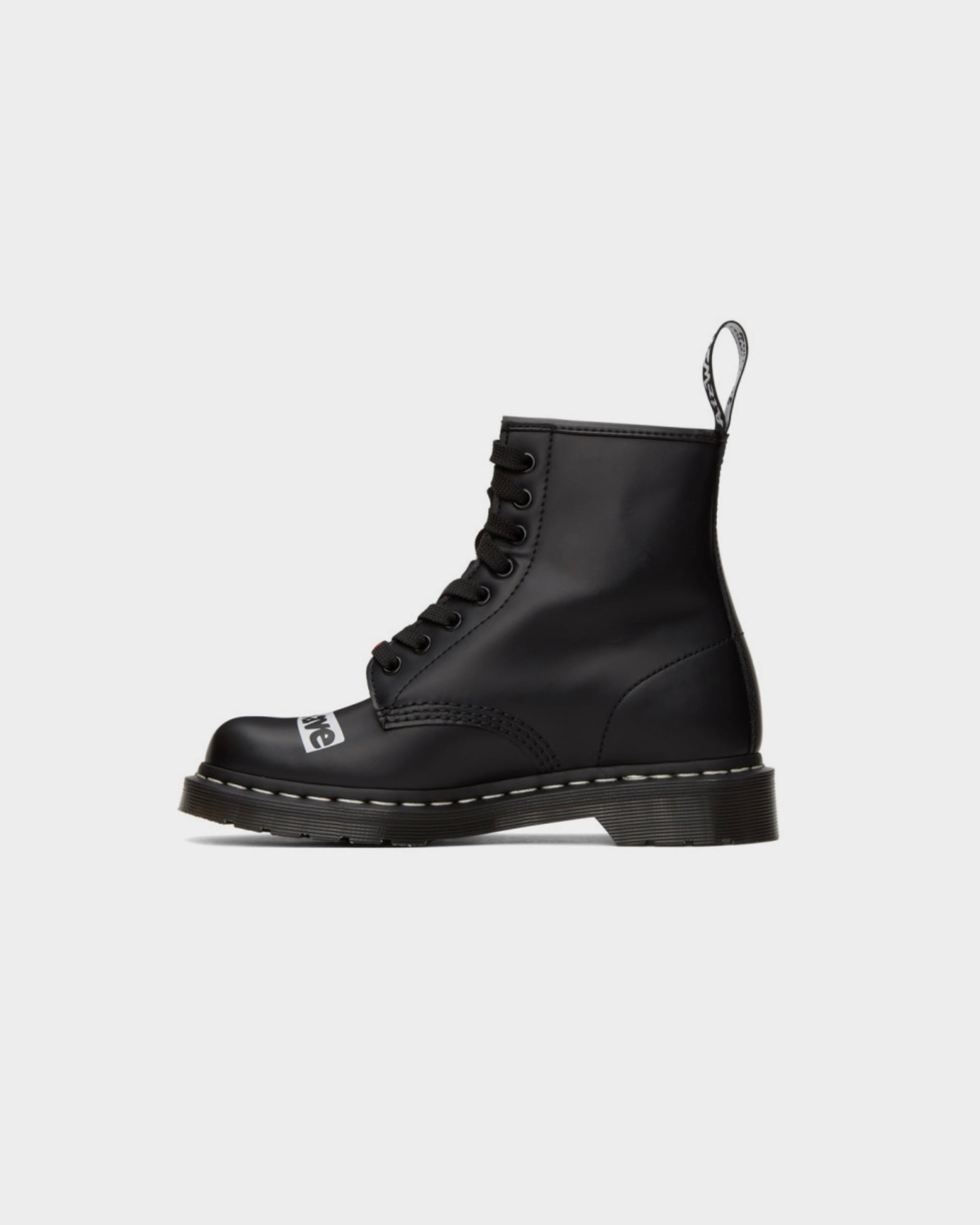 Ankle-high buffed leather boots in black. Mismatching embossed text in white at round toe. Text printed in red at tonal eight-eye lace-up closure. Logo webbing pull-loop in black and white at heel collar. Mismatched embossed text in red at heel counter. Signature white stitching at welt. Twill lining in white and black. Signature Air Cushion rubber sole in tan. Tonal hardware. Alternate lacing in white. Part of the Dr. Martens x Sex Pistols collaboration.