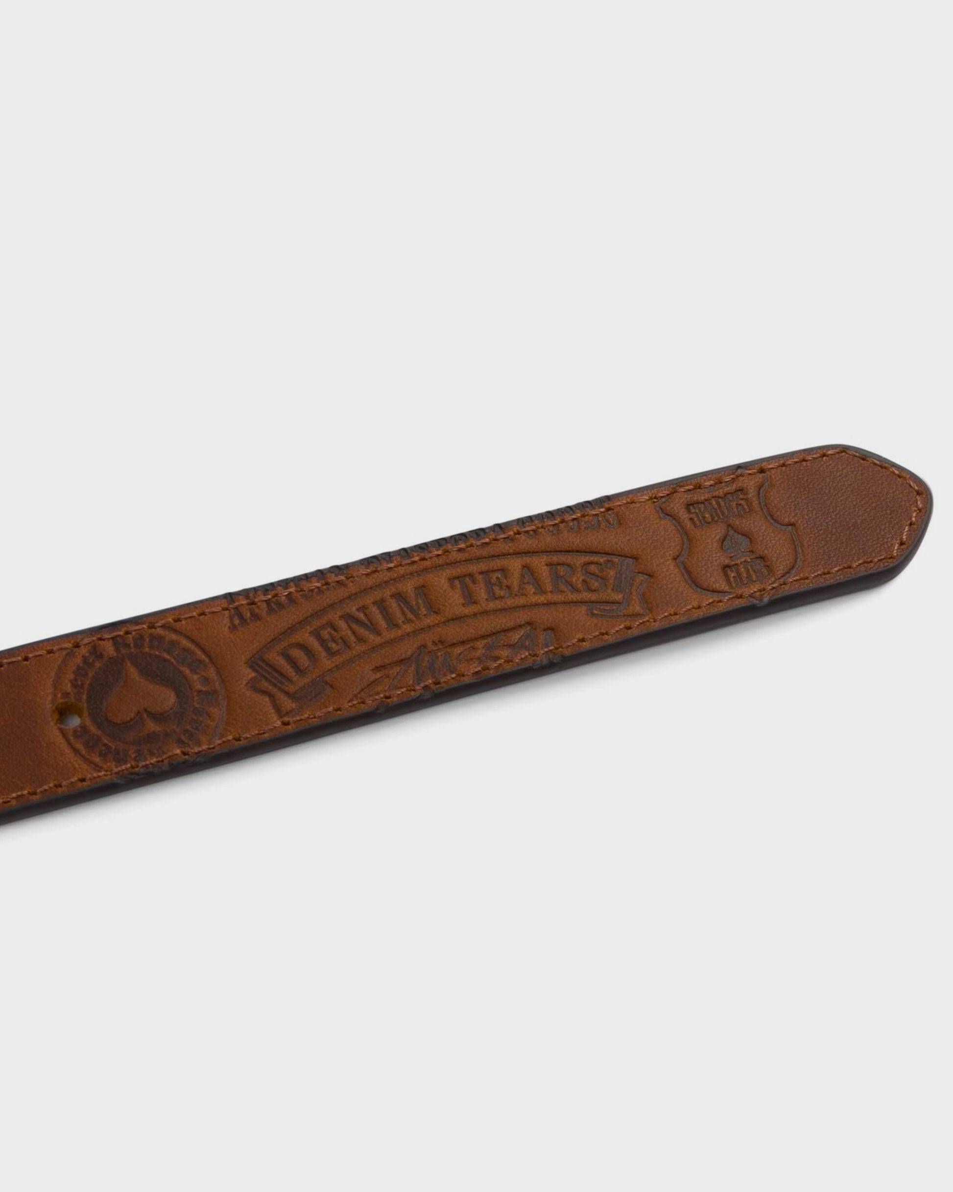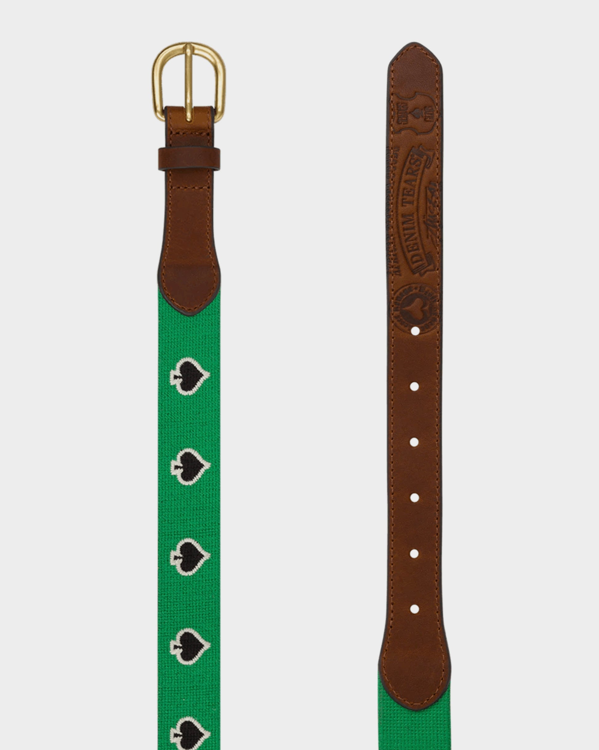 A collector’s piece from the iconic collaboration between Denim Tears and Stüssy, the Spade Needlepoint Belt is a statement accessory crafted with meticulous detail. The belt features a vivid green needlepoint strap embroidered with contrasting spade motifs, balanced with premium brown leather trim embossed with Denim Tears insignia. A solid brass buckle completes the design, offering both durability and a touch of vintage elegance.