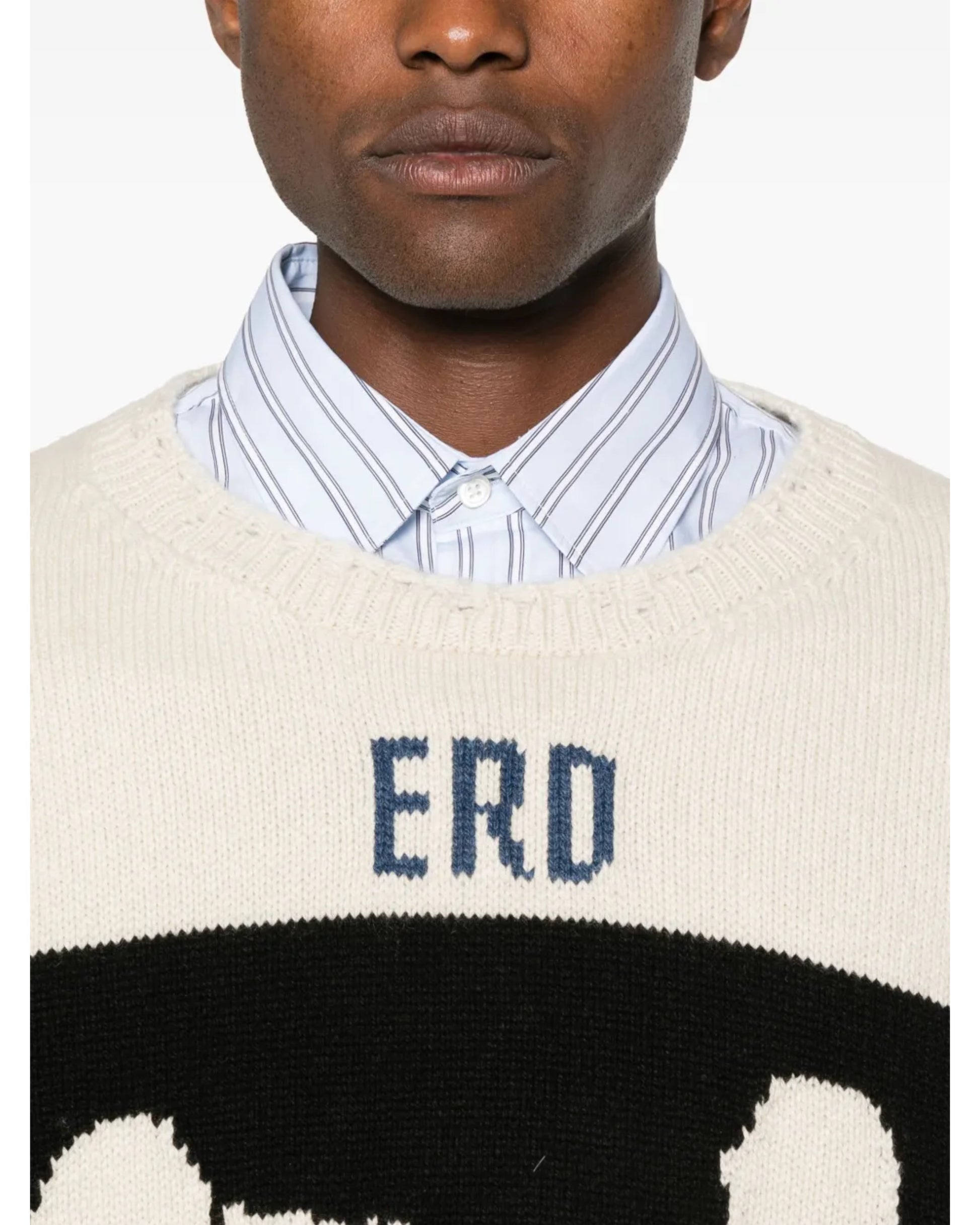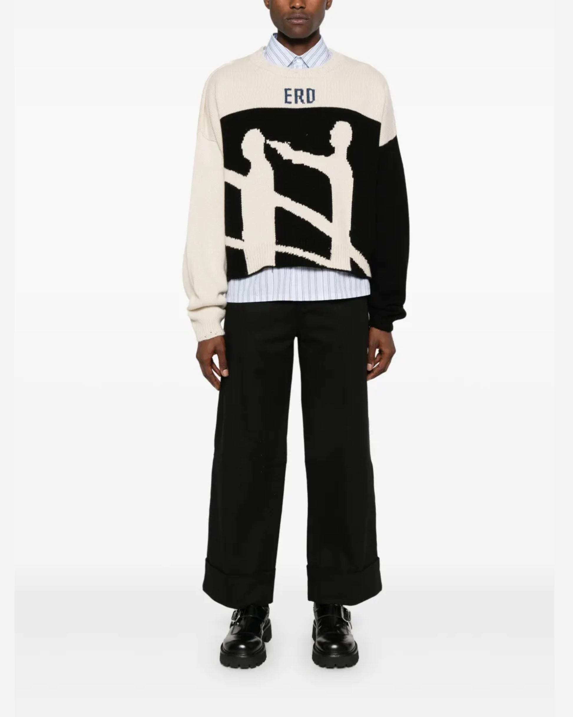 The Echo Fighters Knit features a bold black-and-ivory silhouette graphic—two figures frozen in a moment of confrontation, like a scene paused inside a ring. Textured, heavyweight knit construction gives it a structured drape, while the cropped, relaxed cut makes it easy to layer over shirts, tees, or nothing at all.