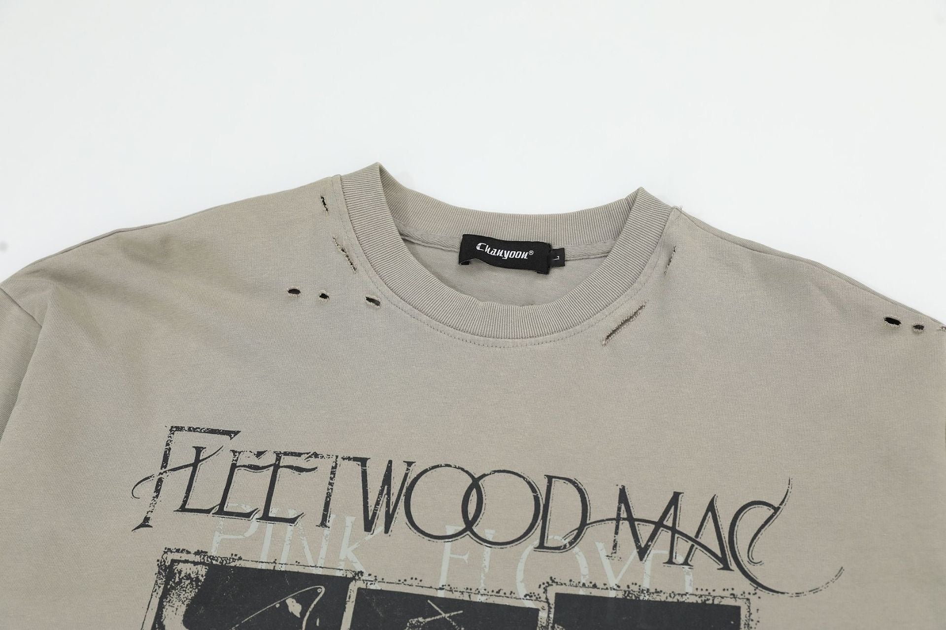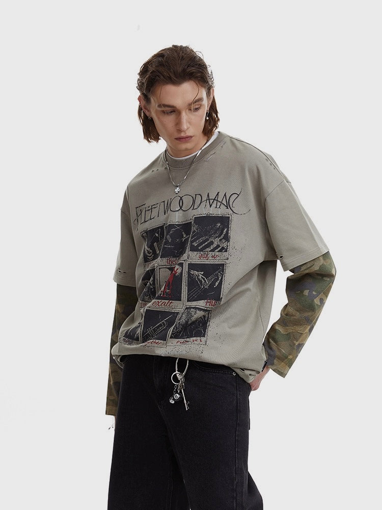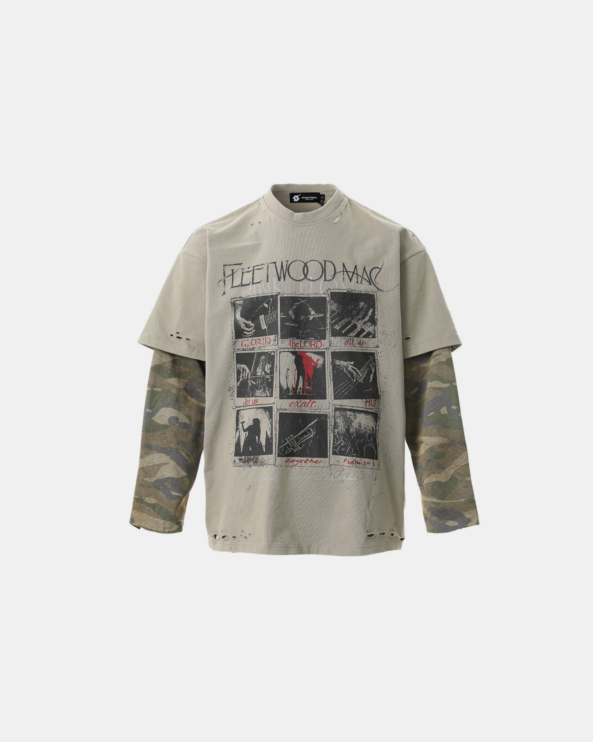 A nod to rock nostalgia — this long-sleeve tee reimagines Fleetwood Mac iconography with raw-edge camo sleeves and patchwork detailing. Faded prints meet grunge energy for a lived-in look that feels like it’s already seen a thousand stages. Whether layered or worn solo, it carries that “tour merch with a twist” vibe — perfect for those who dress with memory and mood.