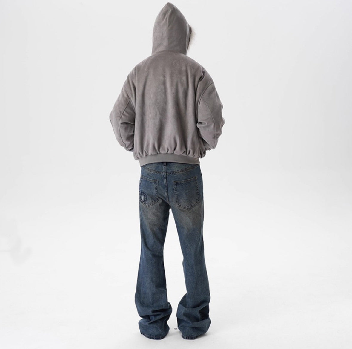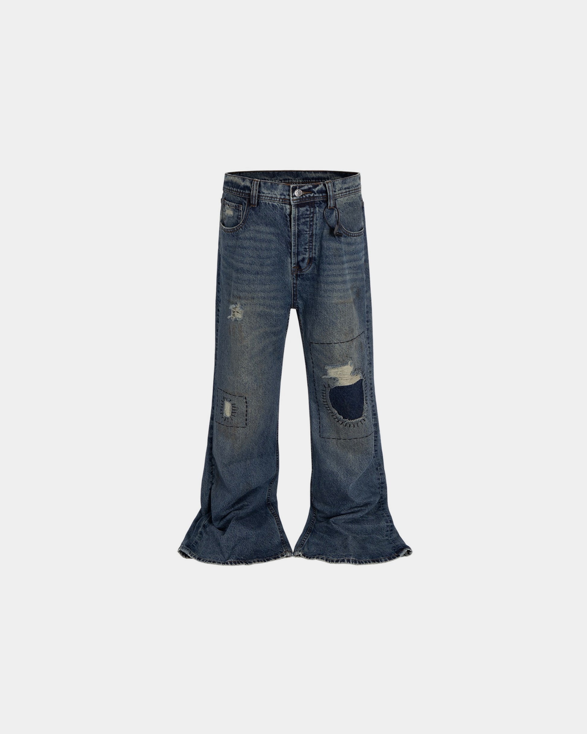 A statement piece that bridges vintage grit with contemporary edge. These jeans feature a relaxed, wide-leg silhouette with exaggerated flare hems for a bold flow. The medium-wash denim is treated with fading and whiskering, paired with raw distressing and reinforced patchwork repairs that add depth and character. Visible hand-stitched detailing frames each patch, amplifying the artisanal feel. Designed with classic five-pocket styling, a mid-rise waist, and a slightly slouched fit, they balance rugged utility with avant-garde streetwear appeal.