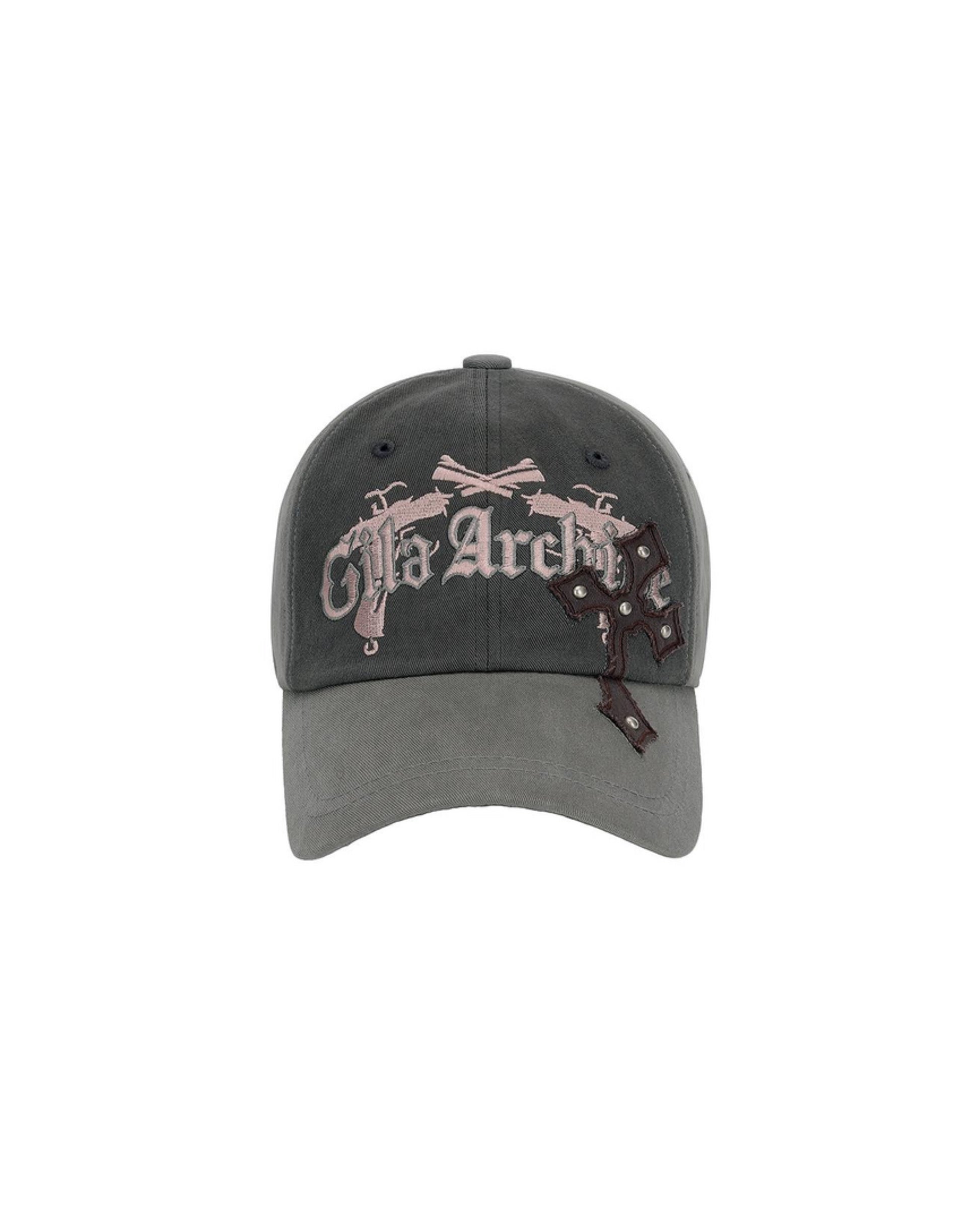 This vintage-inspired grey ballcap features striking cross patch embroidery and stud detailing, creating an edgy yet versatile accessory. The contrasting design elements on the forehead and visor add a distinctive touch, while the premium cotton construction ensures lasting comfort and style. Made in Korea with meticulous attention to detail, this one-size-fits-most cap includes embroidered artwork and logo details that elevate it from a basic accessory to a statement piece.