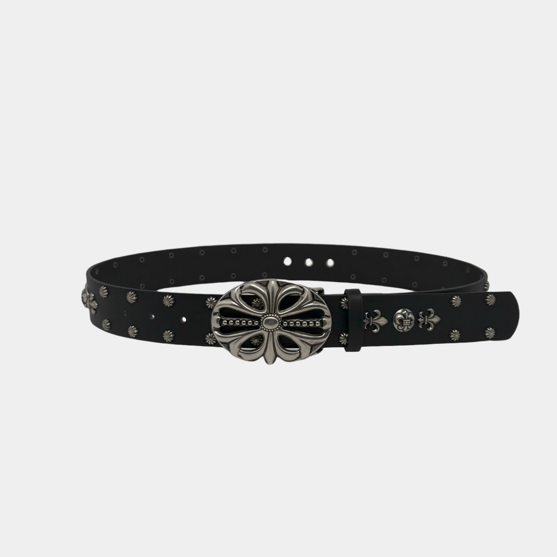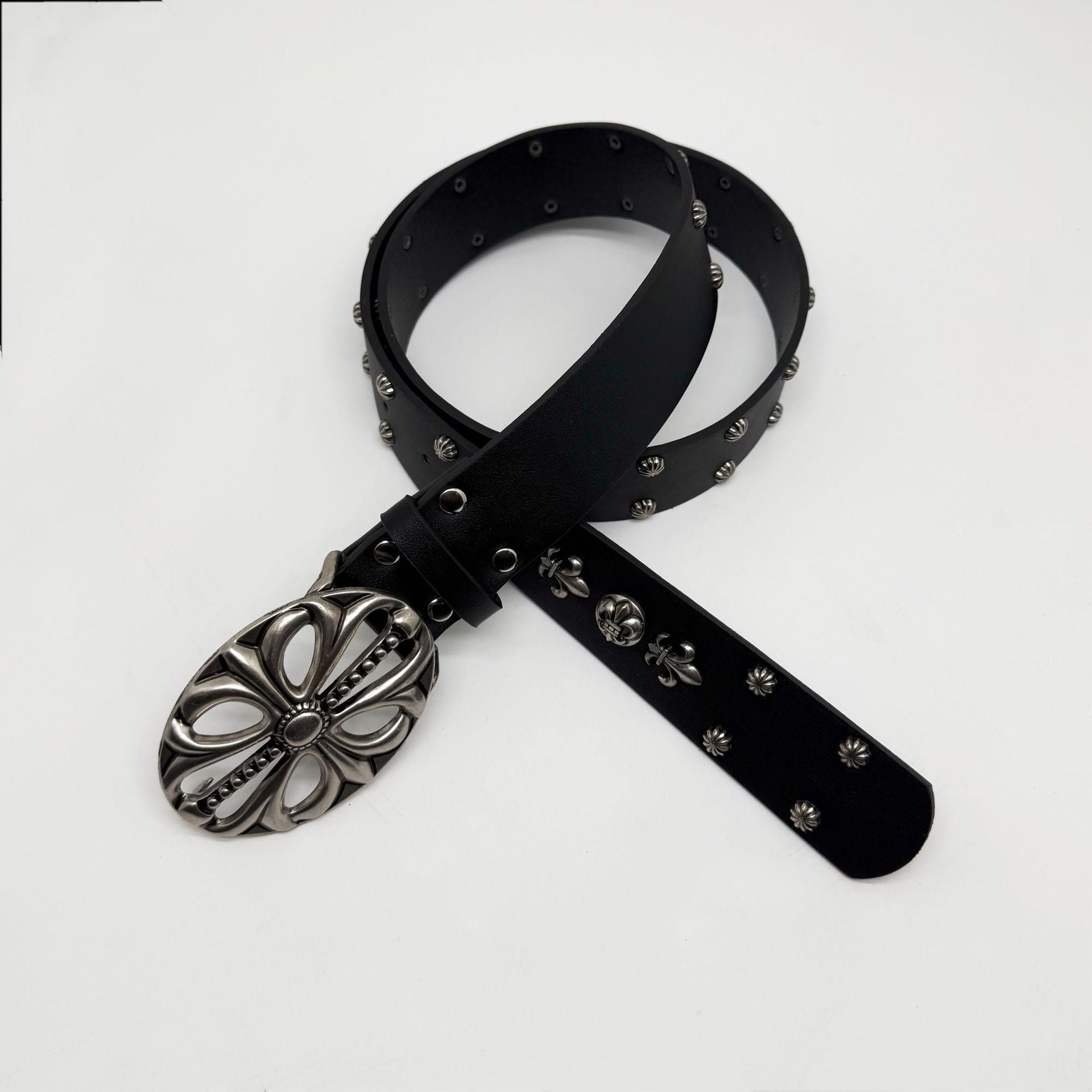 This black leather belt is detailed with oversized gothic cross conchos and silver-tone studs, giving it a raw, street-luxe edge. Adjustable for the perfect fit, it’s built to sit just as well over tailored pants as it does low-slung denim.