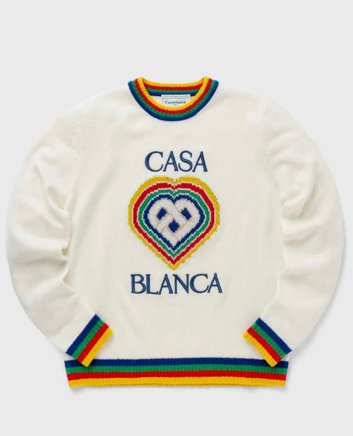 Casablanca puts its graphic spin on knitwear with this white wool-blend jumper. It’s woven with a colourful Heart Boucle motif and embroidered with logo lettering at the front. The coordinating striped ribbed trims reflect the brand’s affinity for sportswear.