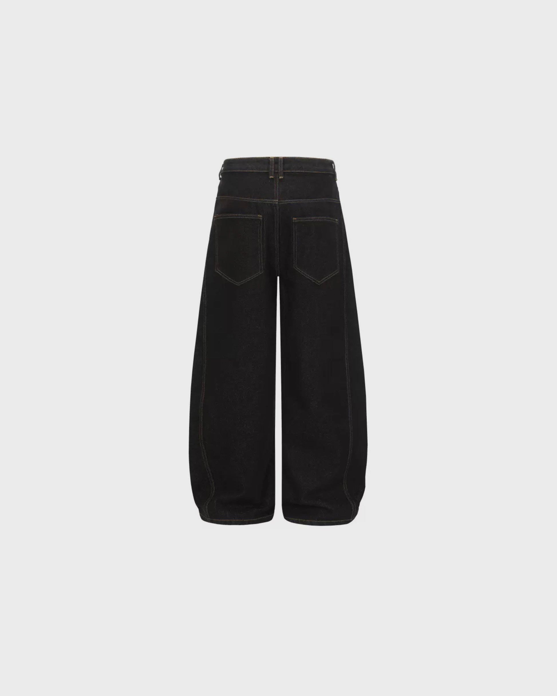 Crafted from structured heavyweight cotton, this wide-leg jean features a distinctive asymmetric button-front closure that cuts diagonally across the waist for a disruptive, statement finish. The deep washed black tone is elevated with contrast stitching, adding subtle detail without overpowering the silhouette.