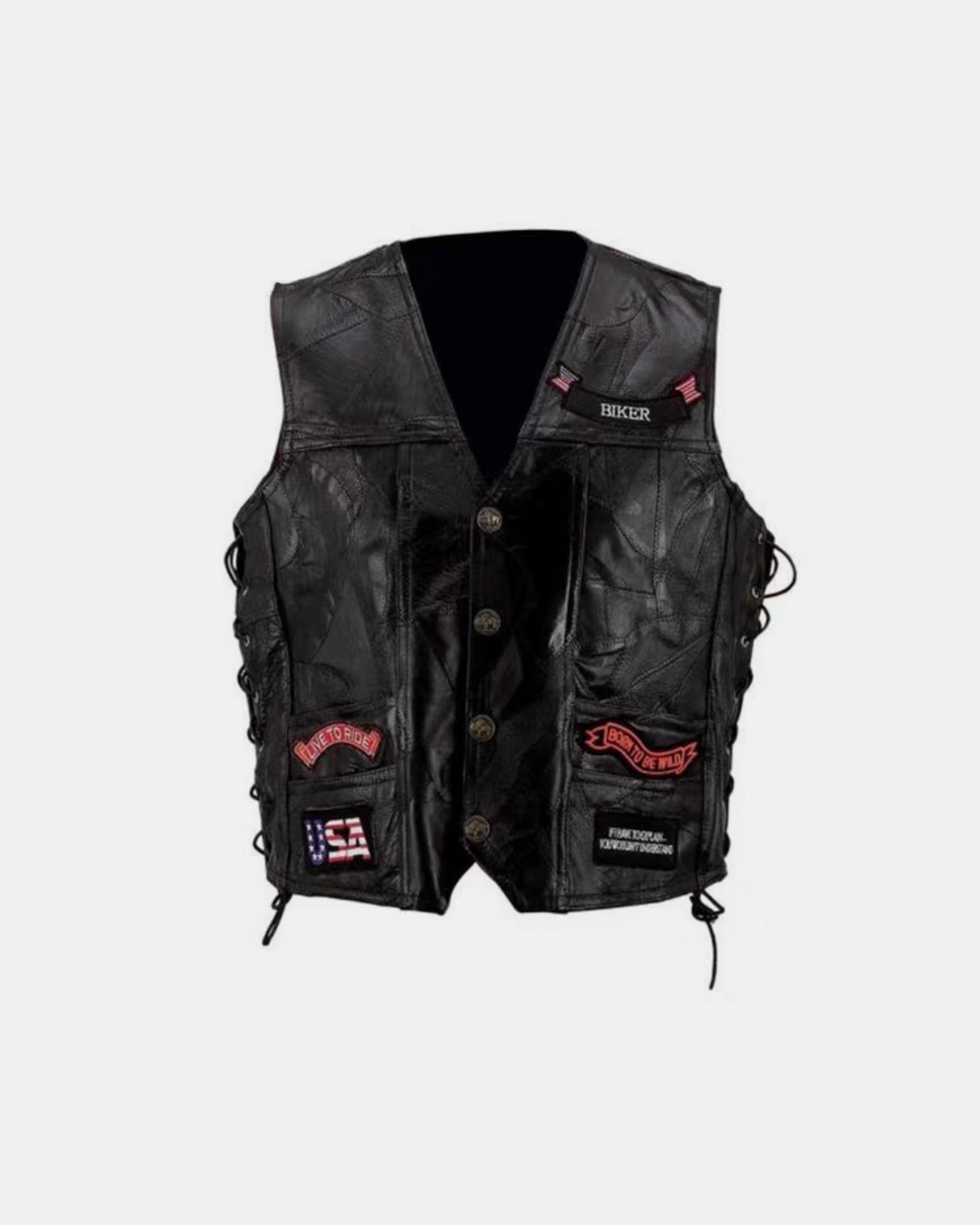 This black leather biker vest carries the spirit of the open road — raw, unapologetic, and built with attitude. Designed in a classic sleeveless cut with side lace detailing for adjustable fit, it’s finished with heavy embroidered patches that speak before you do.