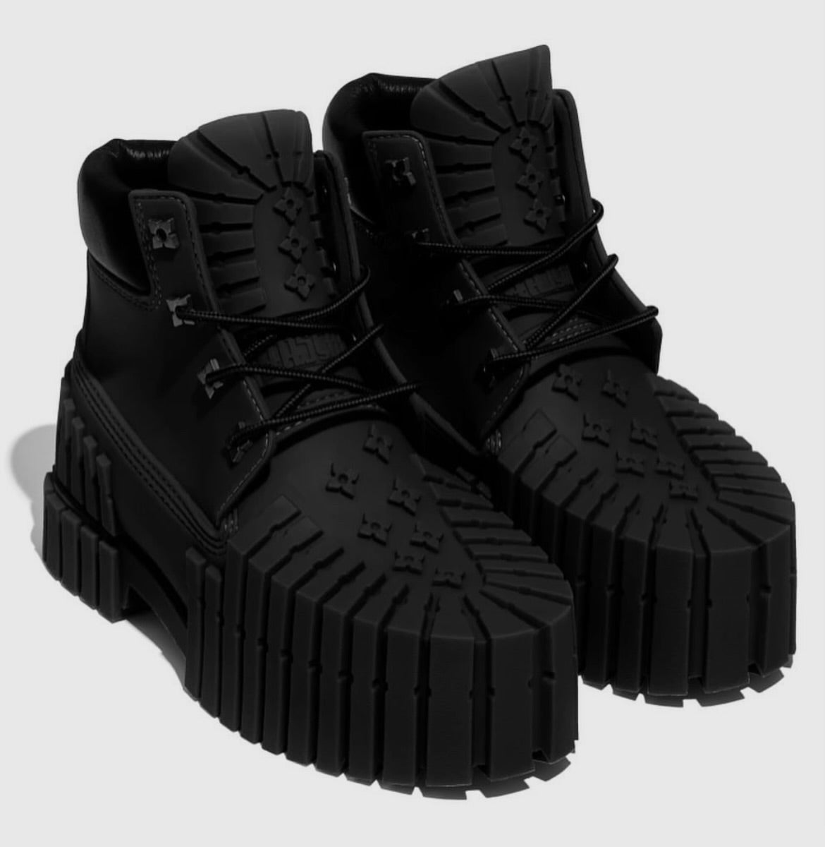 MSCHF 2X4 Boots. Black leather and rubber upper with a signature design, the outsole pattern extends from the tread to the toe box and heel counter, tongue included. Round toeline with clasic lace-up fastening, golden-tone eyelets. Logo detailing.