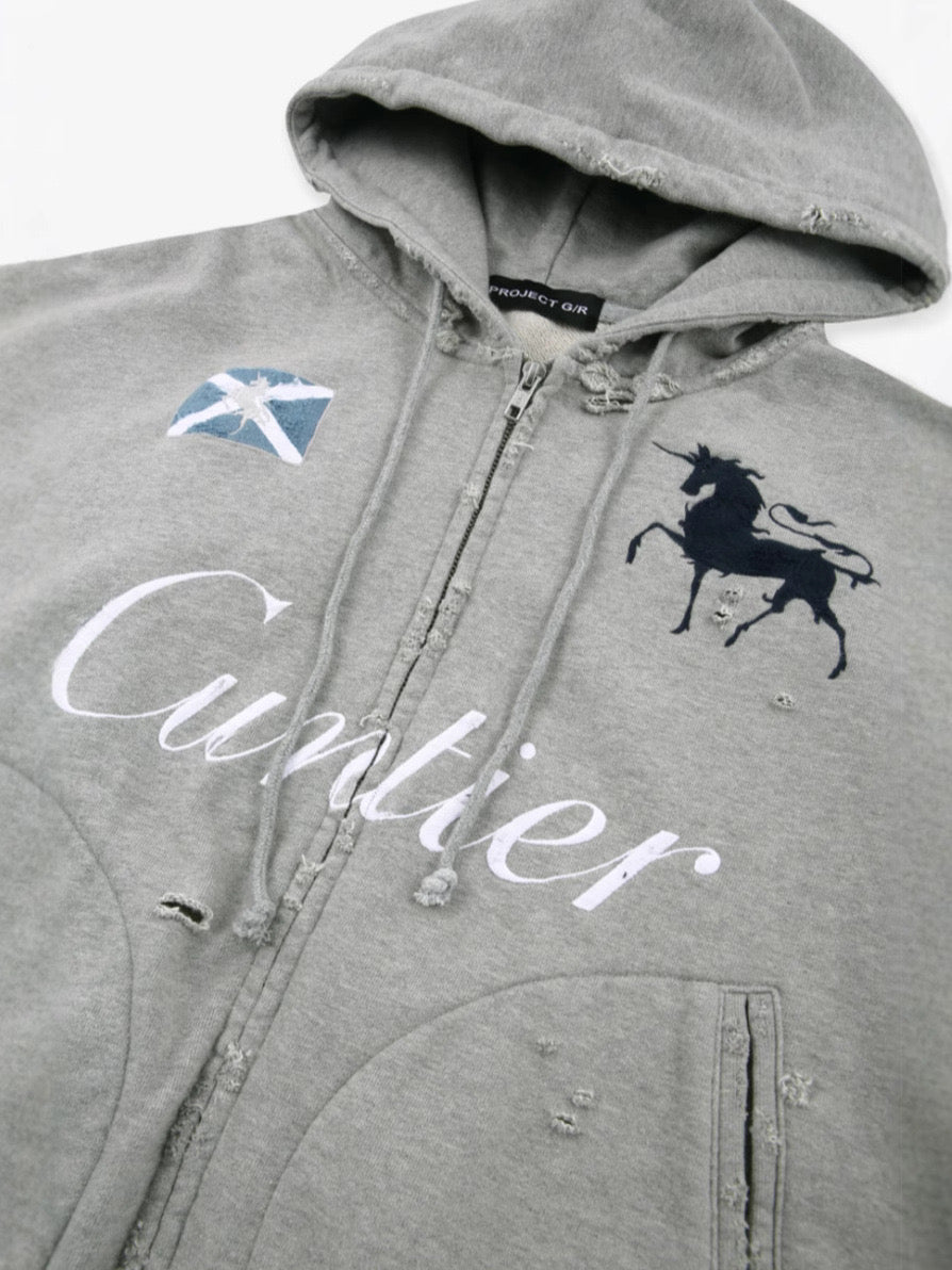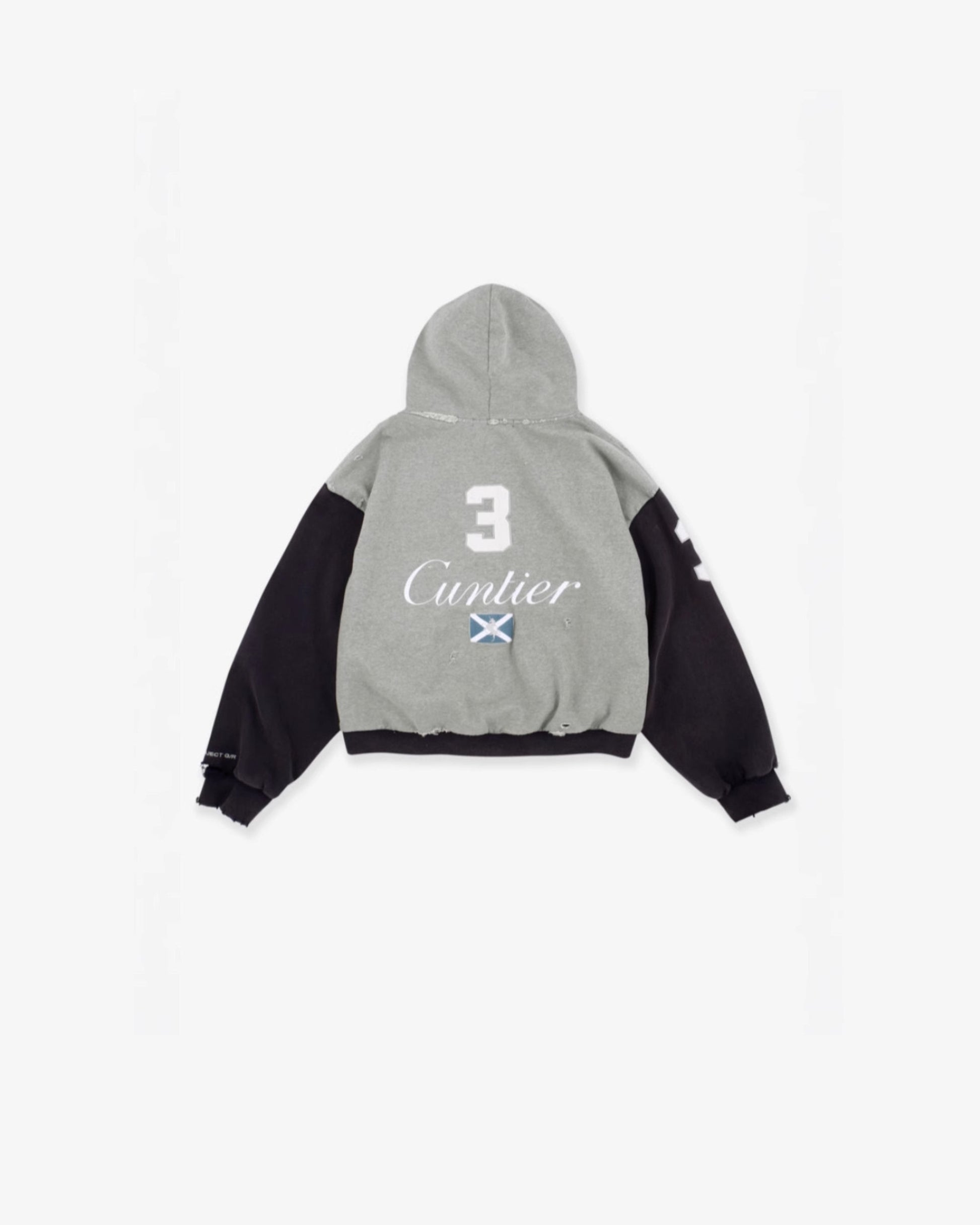 Defiant and raw, the Cuntier Hoodie captures Project G/R’s instinct for rebellion through cut-and-sew chaos and unapologetic graphics. Built from heavyweight fleece with contrasting panels, it layers heritage symbols, stitched patchwork, and hand-finished distressing into a silhouette that feels both unruly and intentional.