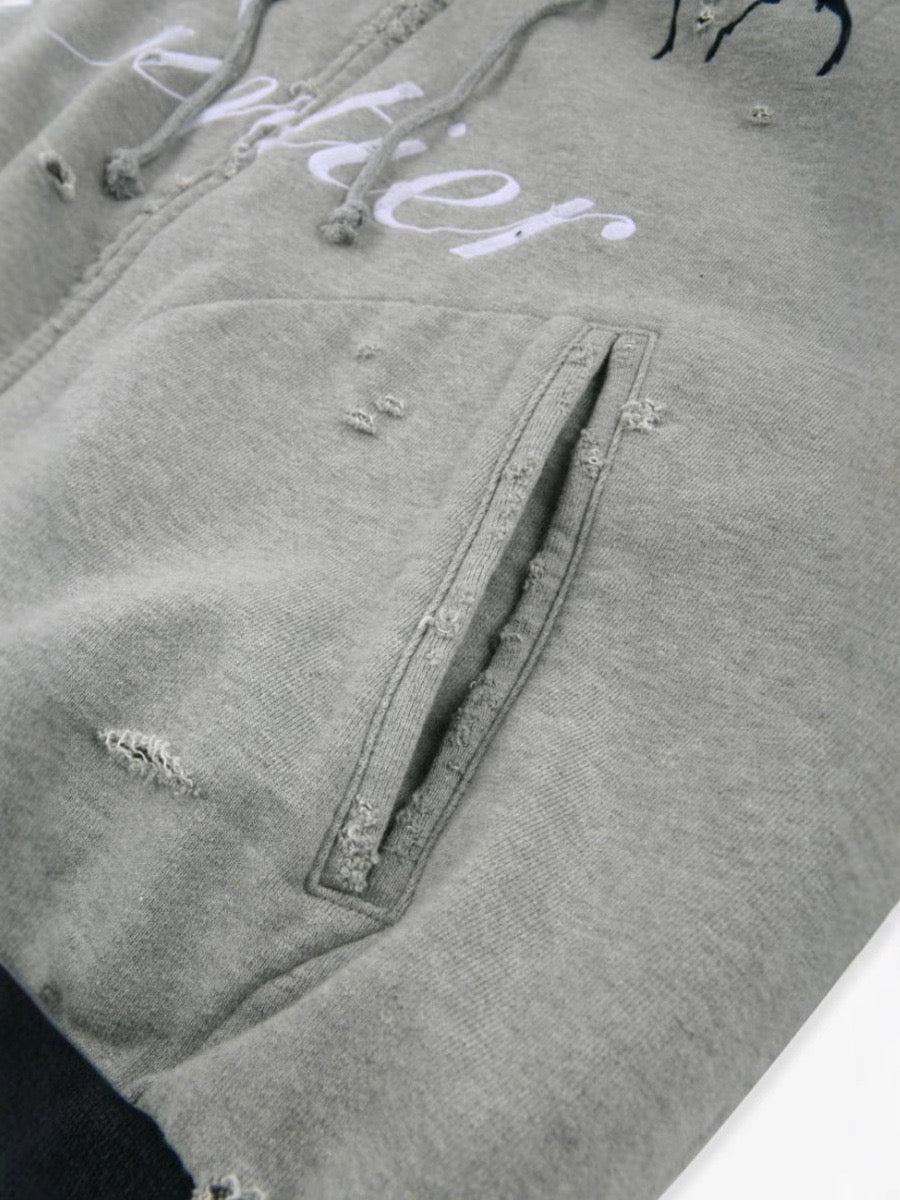 The oversized fit, elongated drawstrings, and worn-in edges give it a subcultural weight — the kind of piece that looks lived-in from day one, yet carries presence anywhere it’s thrown on. Finished with front embroidery and back hits that push the narrative of identity and conflict, this is more than a hoodie; it’s a manifesto stitched into fabric.