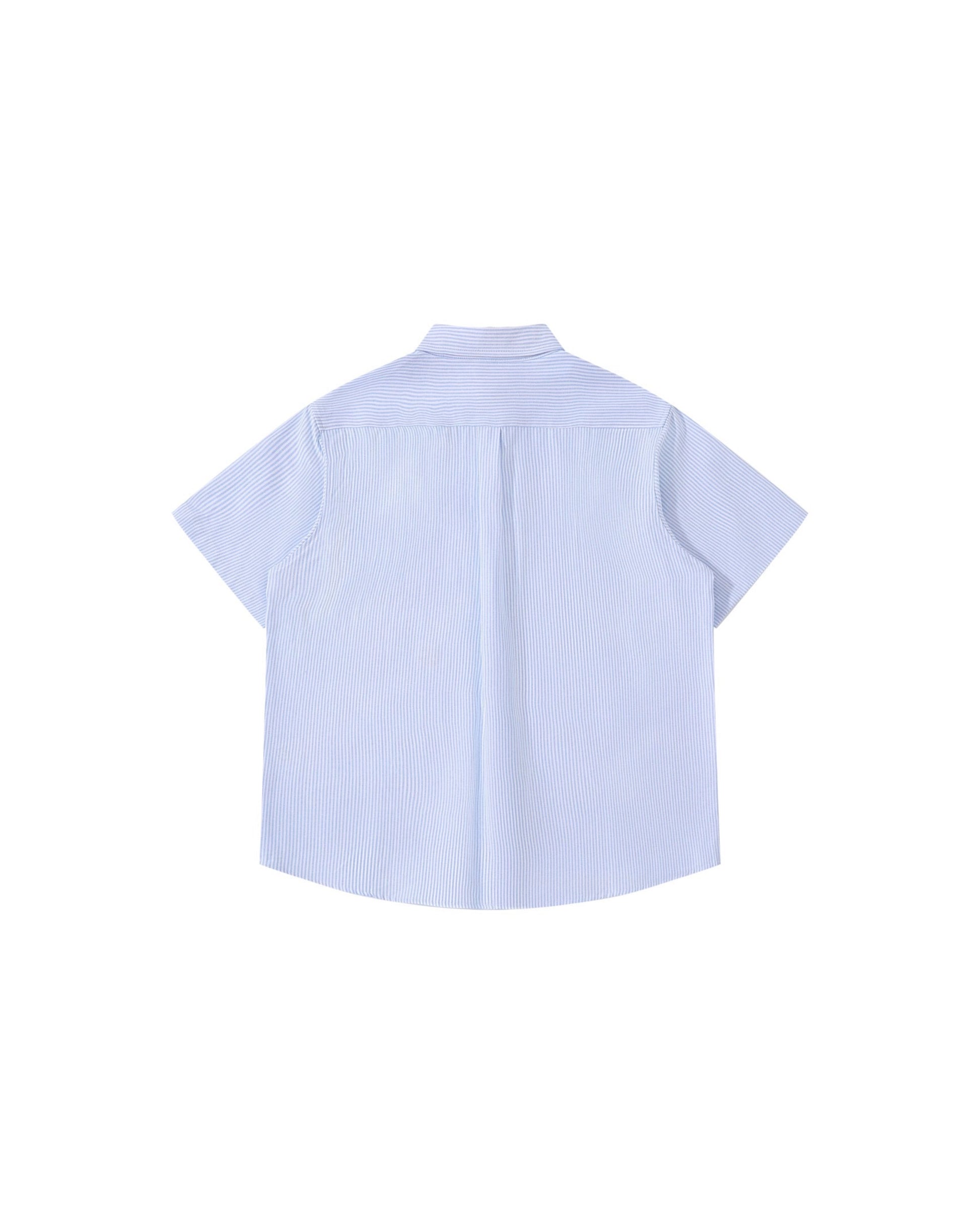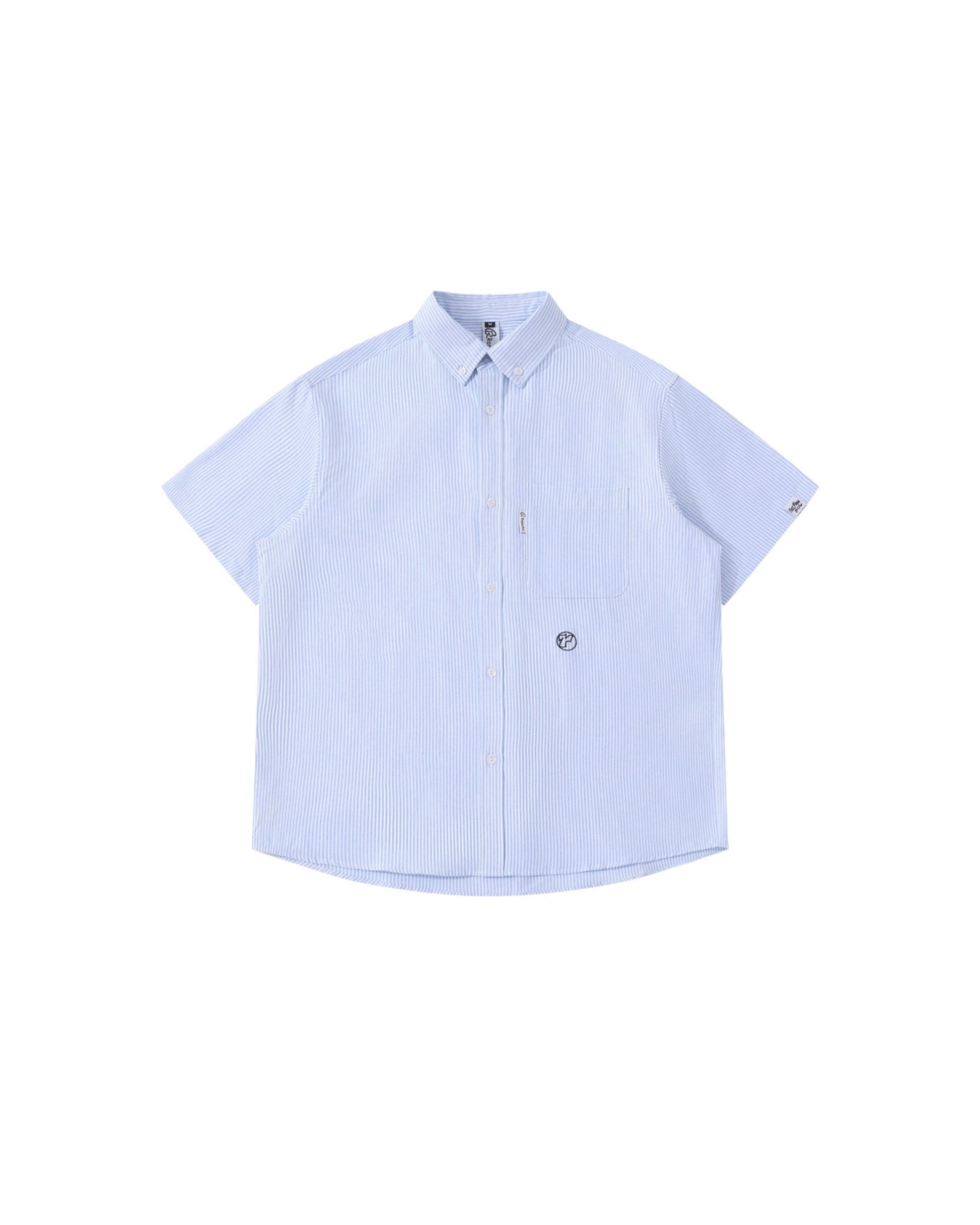 This Ruiiers x Ropucha striped shirt features a soft blue-on-white vertical pattern, cut in a relaxed short-sleeve silhouette that balances sharp tailoring with ease. Designed with a button-down collar, clean chest pocket detailing, and subtle branded accents, it sits comfortably between smart and casual