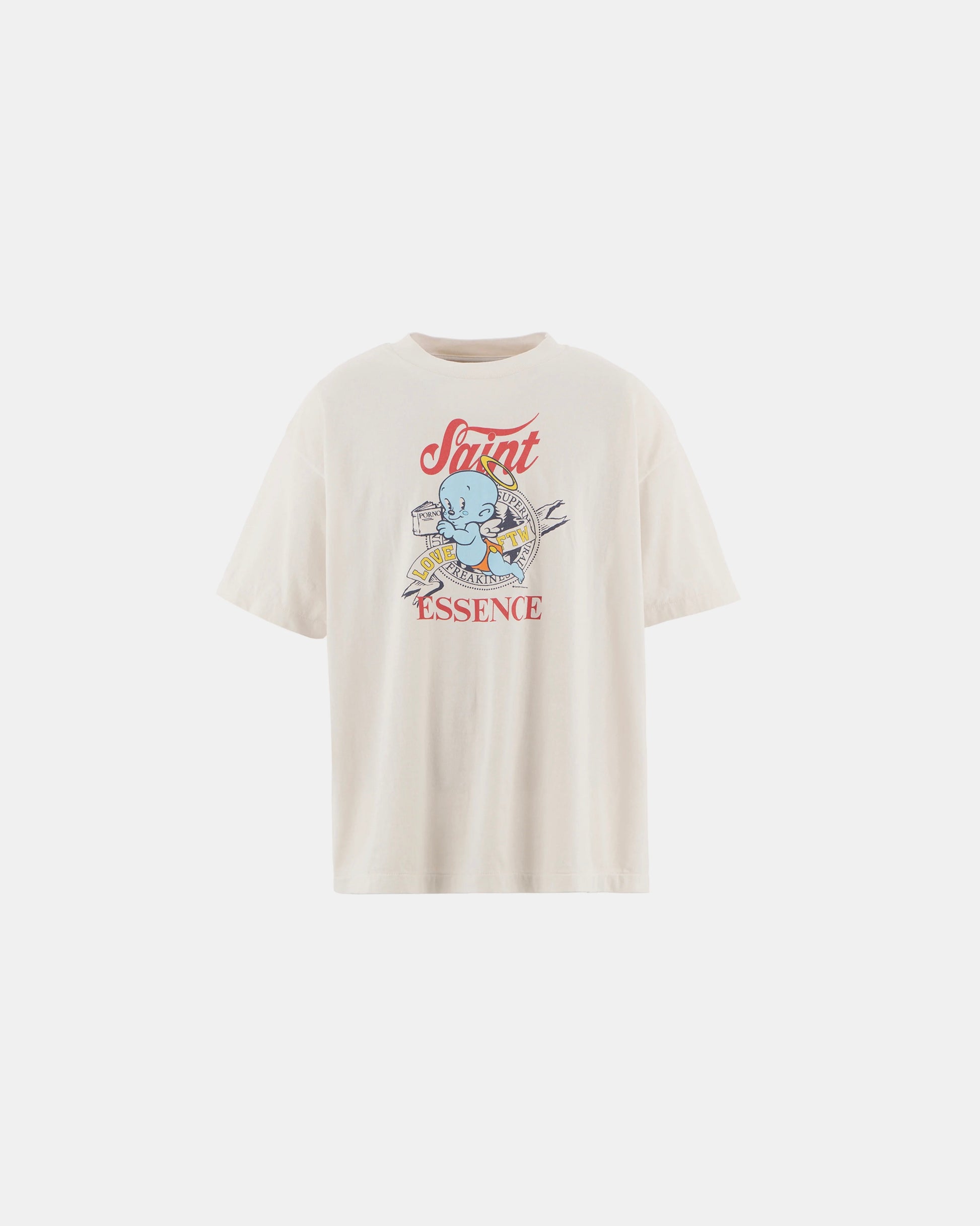 The Baby Saint Mxx Tee is a playful yet statement piece that blends innocence with bold street codes. Cut from soft premium cotton in an easy boxy silhouette, it features a cartoon-style cherub graphic paired with the word Saint in striking red typography, layered over subtle references like “Essence” and “Love Breaking.” The creamy off-white base makes it versatile, while the oversized fit gives it that relaxed, culture-forward energy.