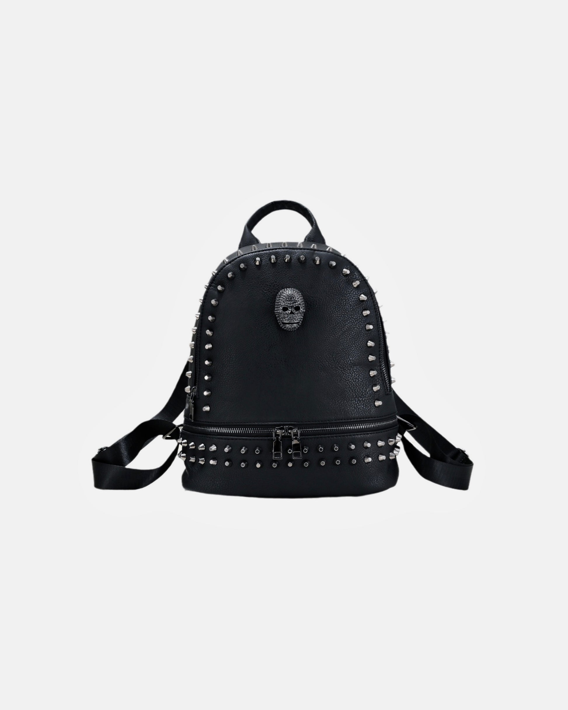 Dark, sleek, and unapologetically bold. The Skull Rivet Backpack takes a classic street silhouette and pushes it into darker territory. Constructed from durable textured leather, its surface is armored with silver-tone rivets and anchored by a sculpted skull emblem that sets the tone—rebellion refined.