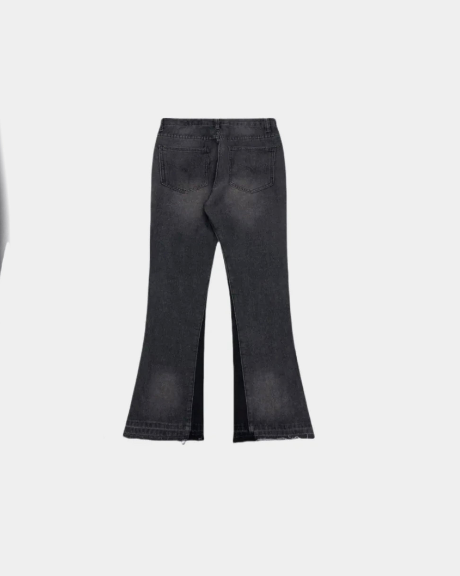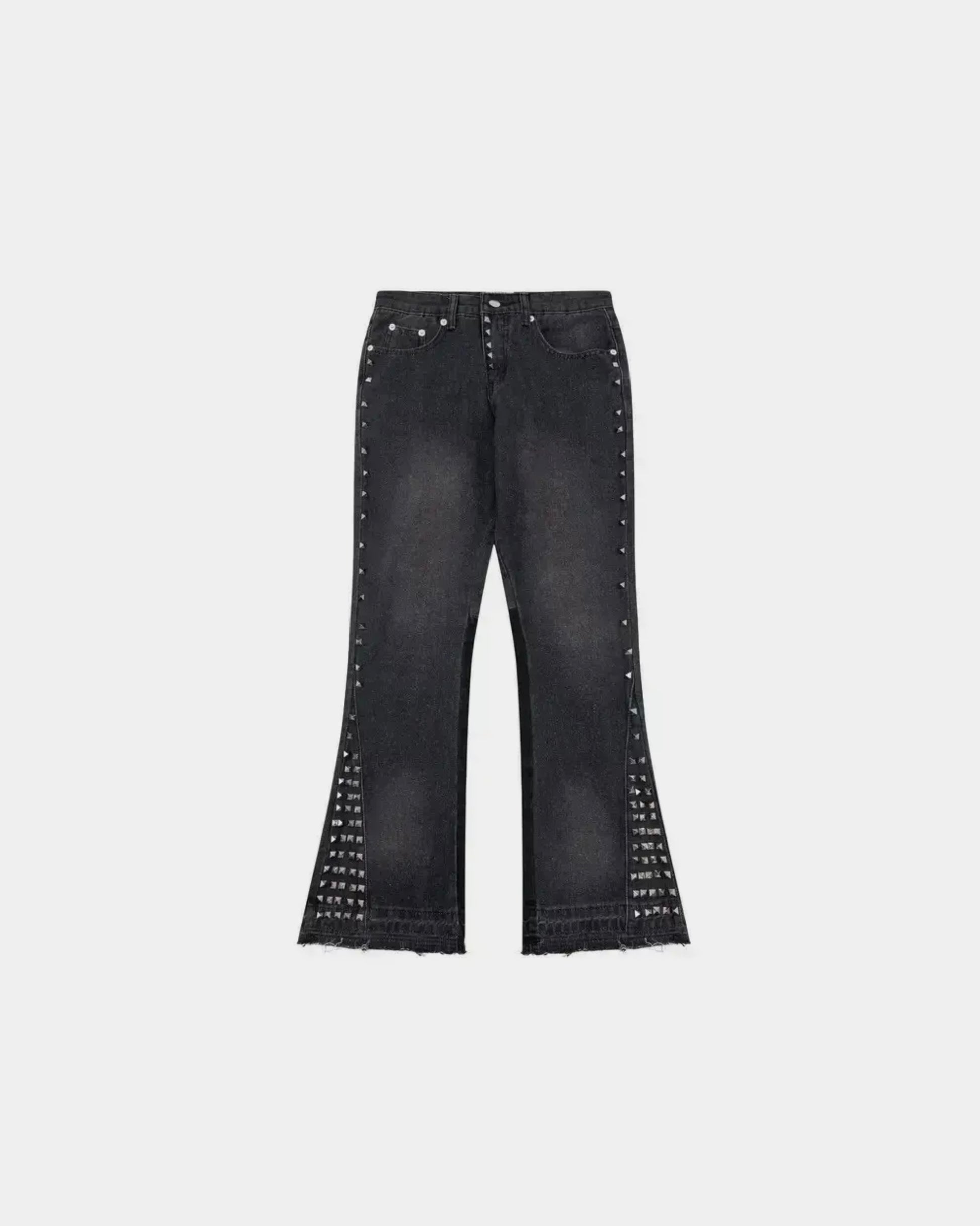 These washed black denim pants are cut with a subtle flare and finished with metal stud detailing running cleanly down the sides — controlled from the waist, expressive at the hem.
