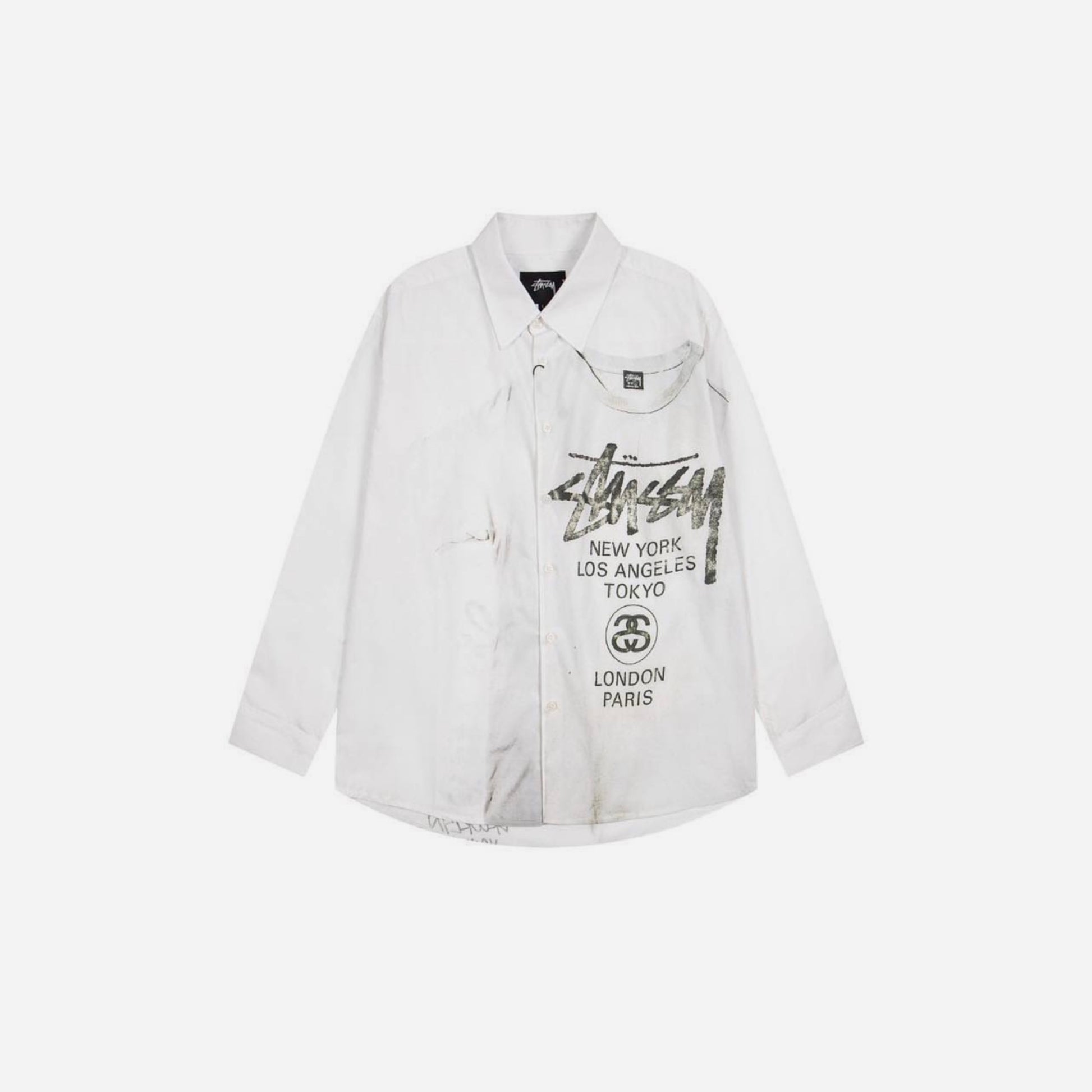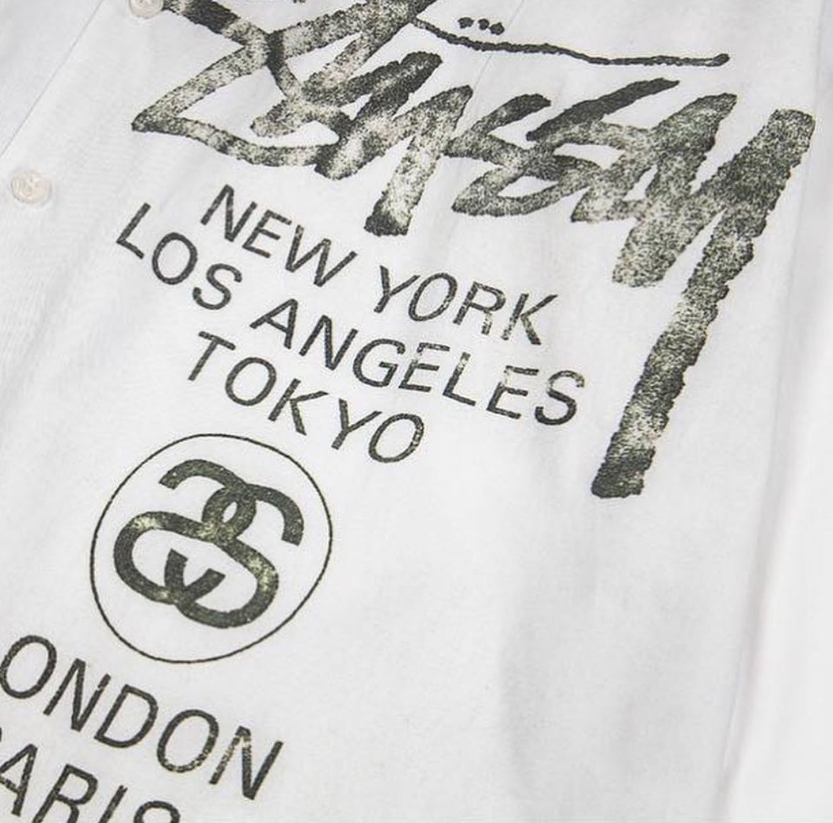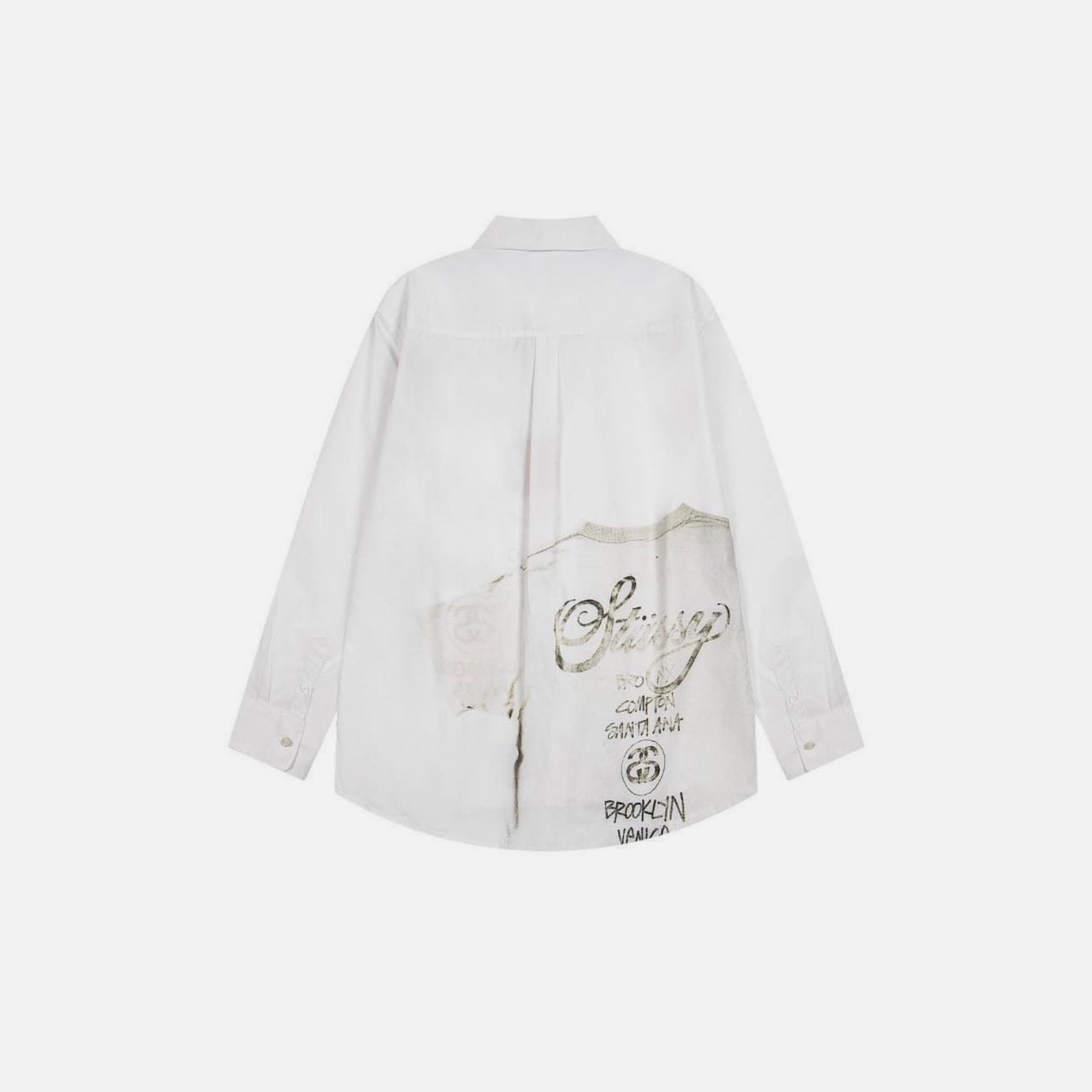 This rare Stüssy piece blends a crisp button-down with a tee-style overlay—creating the illusion of layered streetwear in a single design. Faded graphic print. Raw edge finish.
