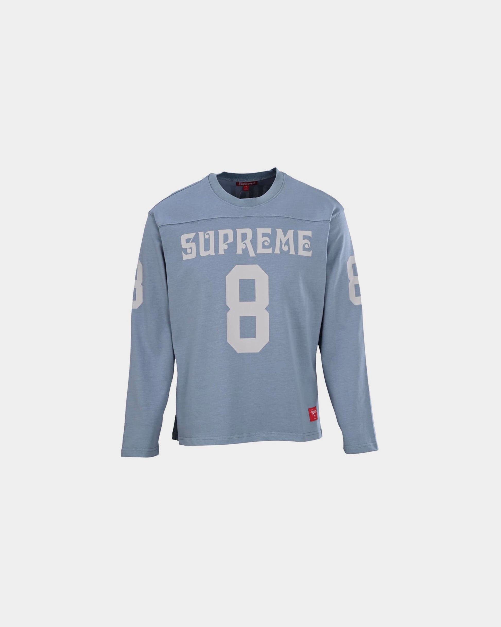 Supreme’s football-inspired long sleeve brings vintage athletic energy into the streetwear arena. Dropped in a muted Slate colorway, the piece balances bold branding with a laid-back silhouette — an instant seasonal staple.