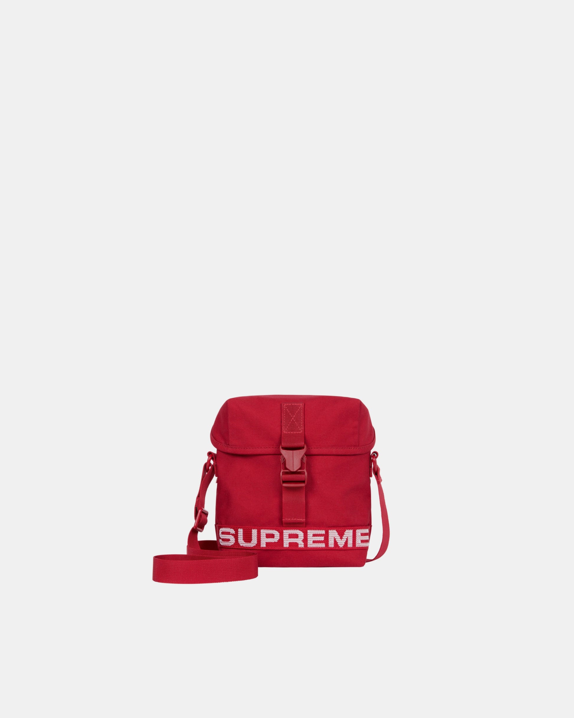 Water resistant cotton nylon blend with embossed logo lining. Main compartment with top flap and buckle closure. Adjustable shoulder strap. Woven logo webbing at lower front.