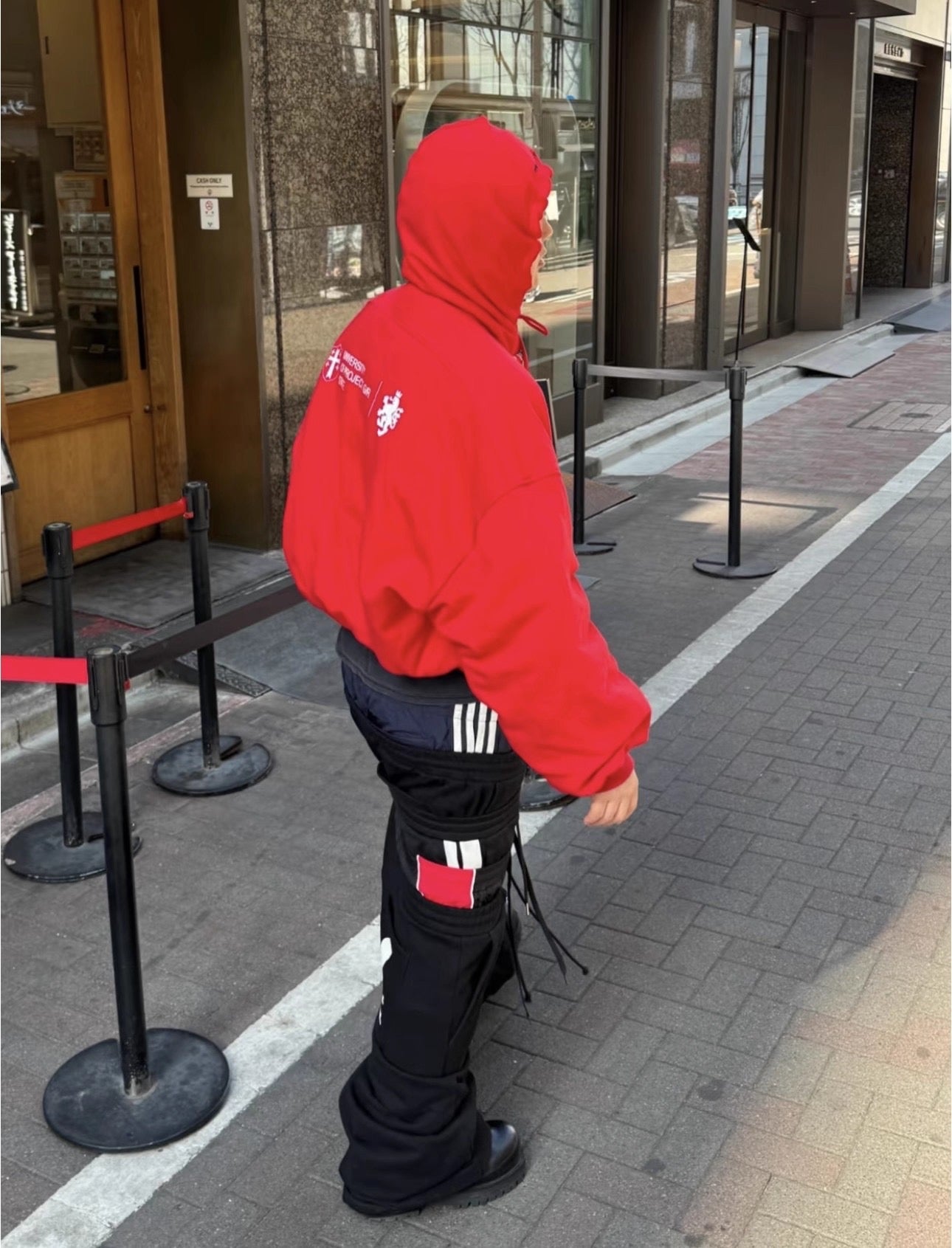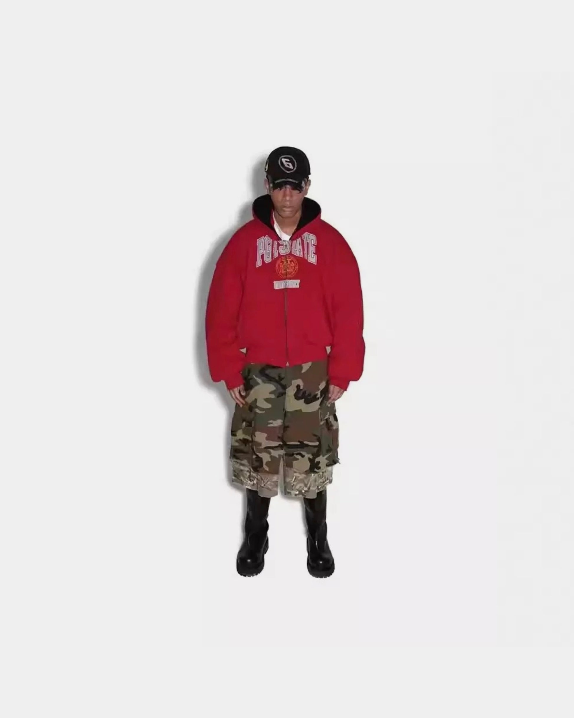 One side features a bold red zip-up hoodie construction with varsity-style graphics and crest detailing — expressive, youthful, and unapologetic. Reverse it to reveal a classic black padded flight jacket silhouette: minimal, functional, and quietly powerful.