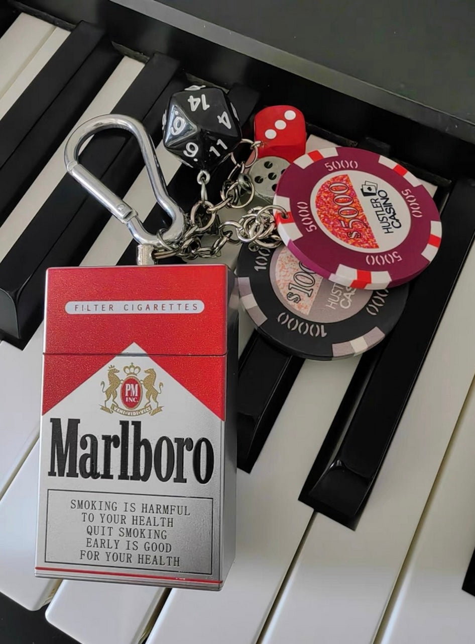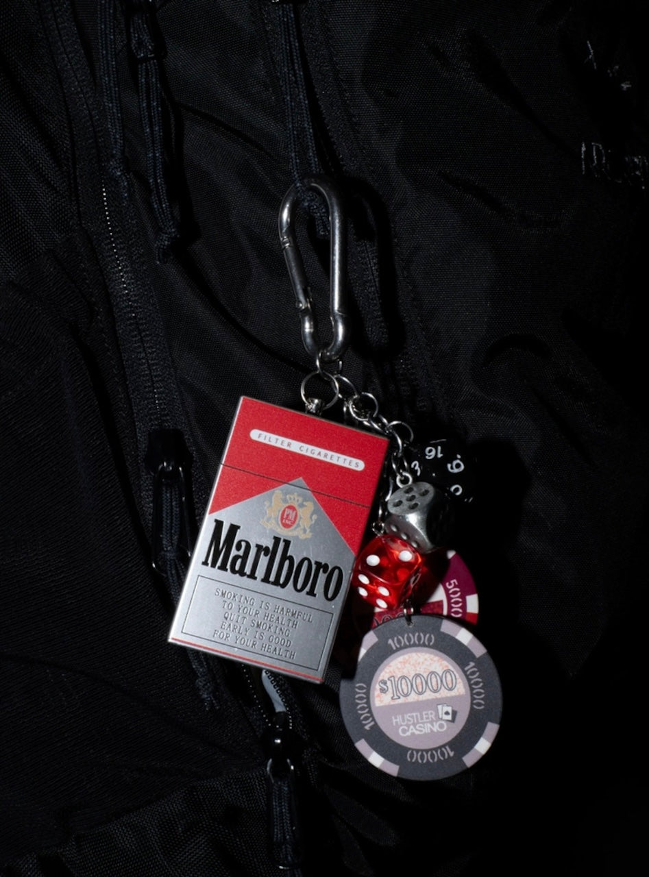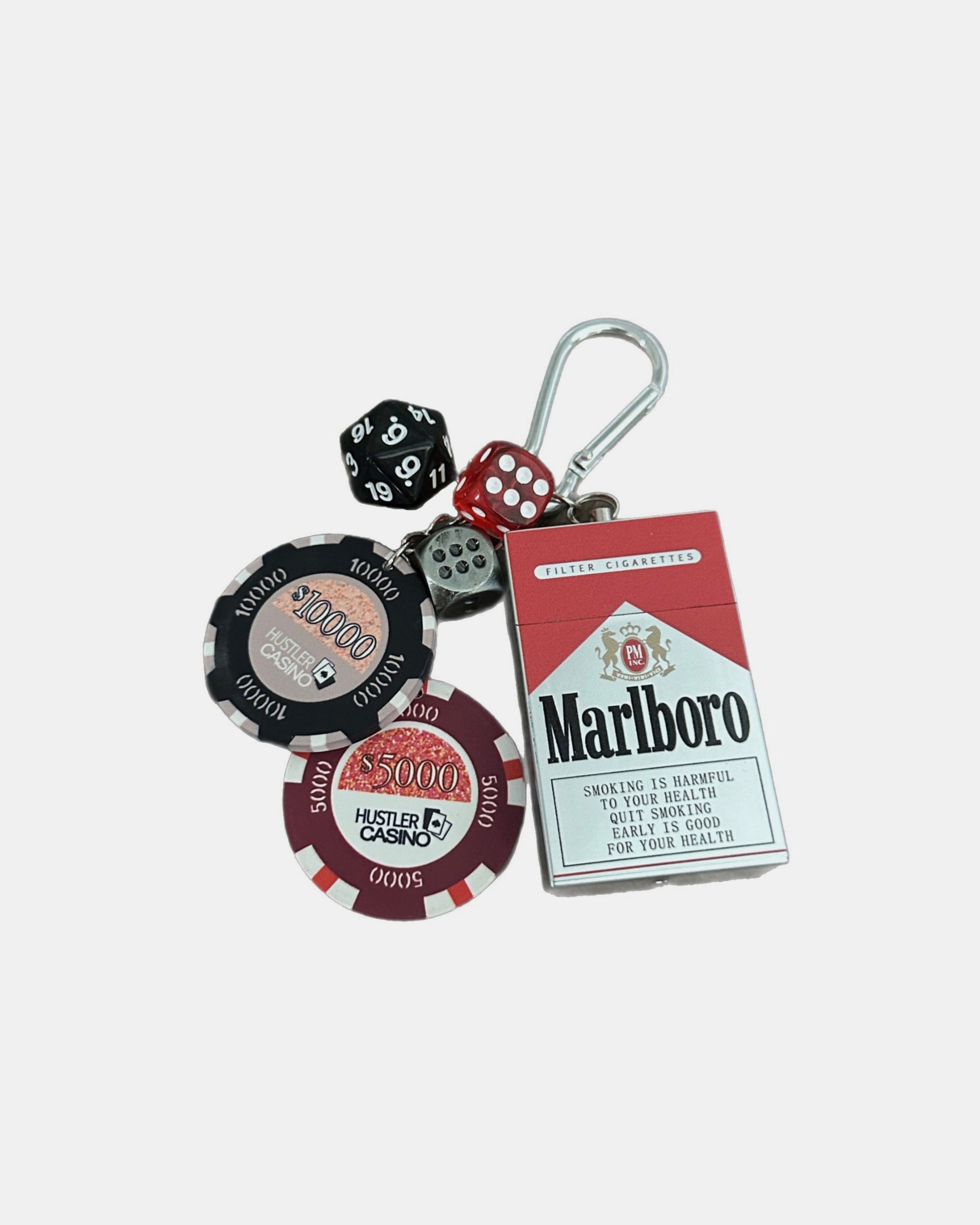 The BAD HABITS charm fuses vintage indulgence with street-coded edge — featuring a retro Marlboro cigarette box, high-stakes Hustler Casino chips, and a trio of game-night dice.