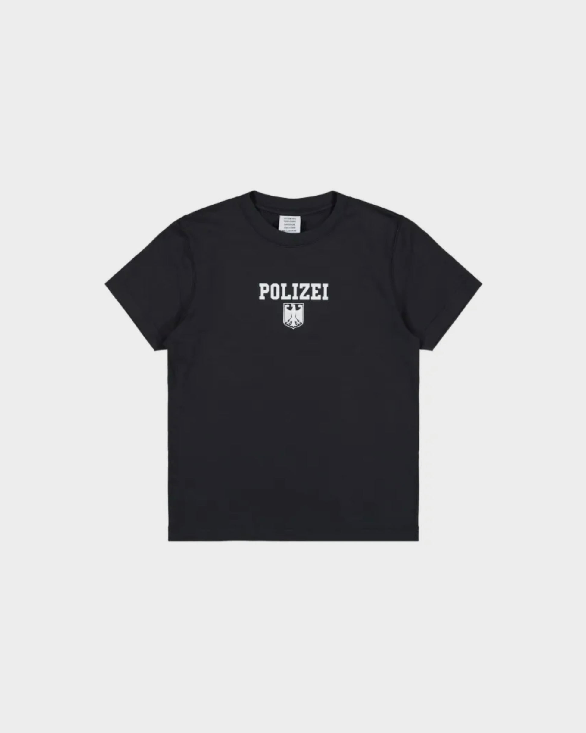 Features a "Polizei" print on the chest and an embroidered logo on the back of the neck, with a ribbed crew neck and straight hem.