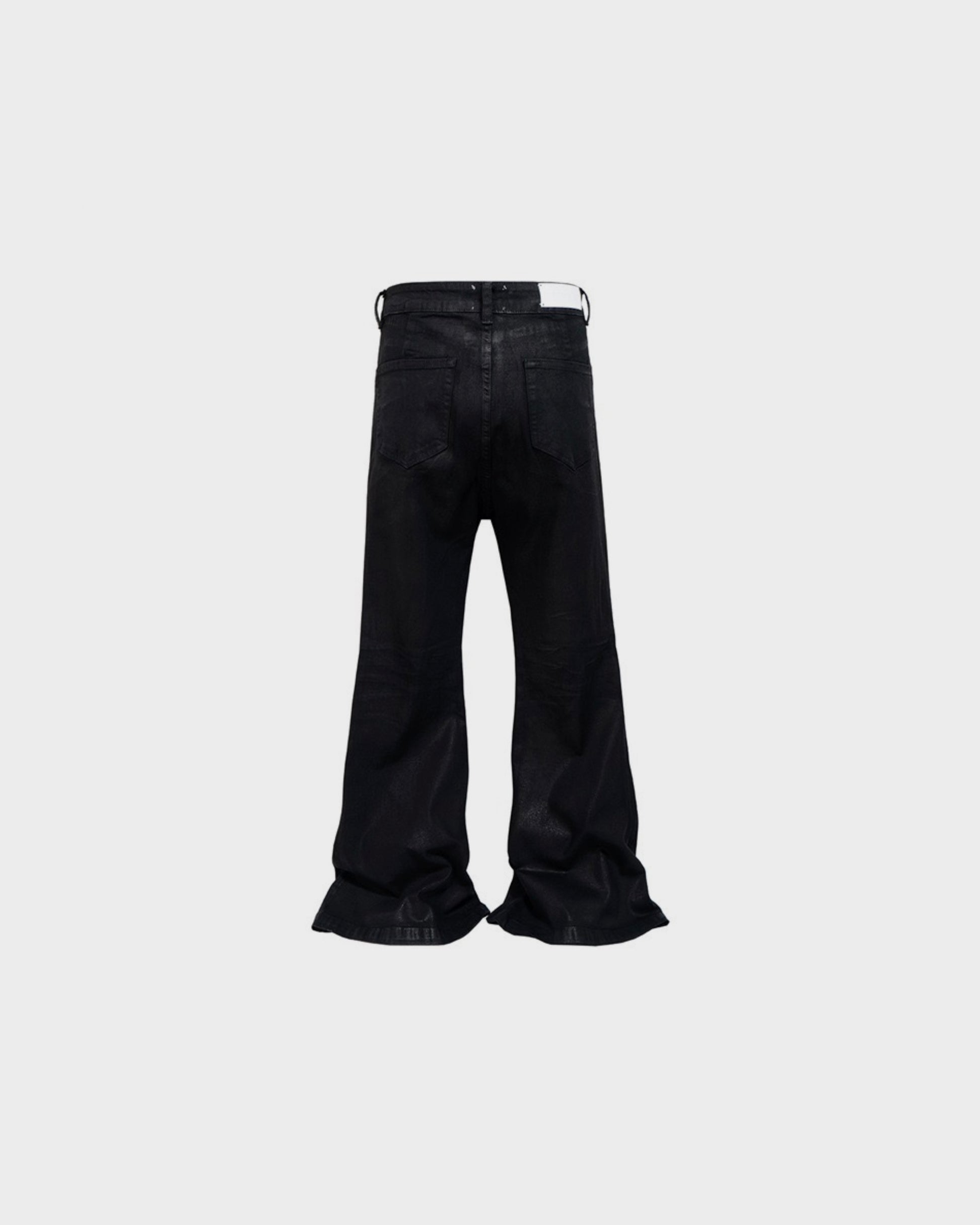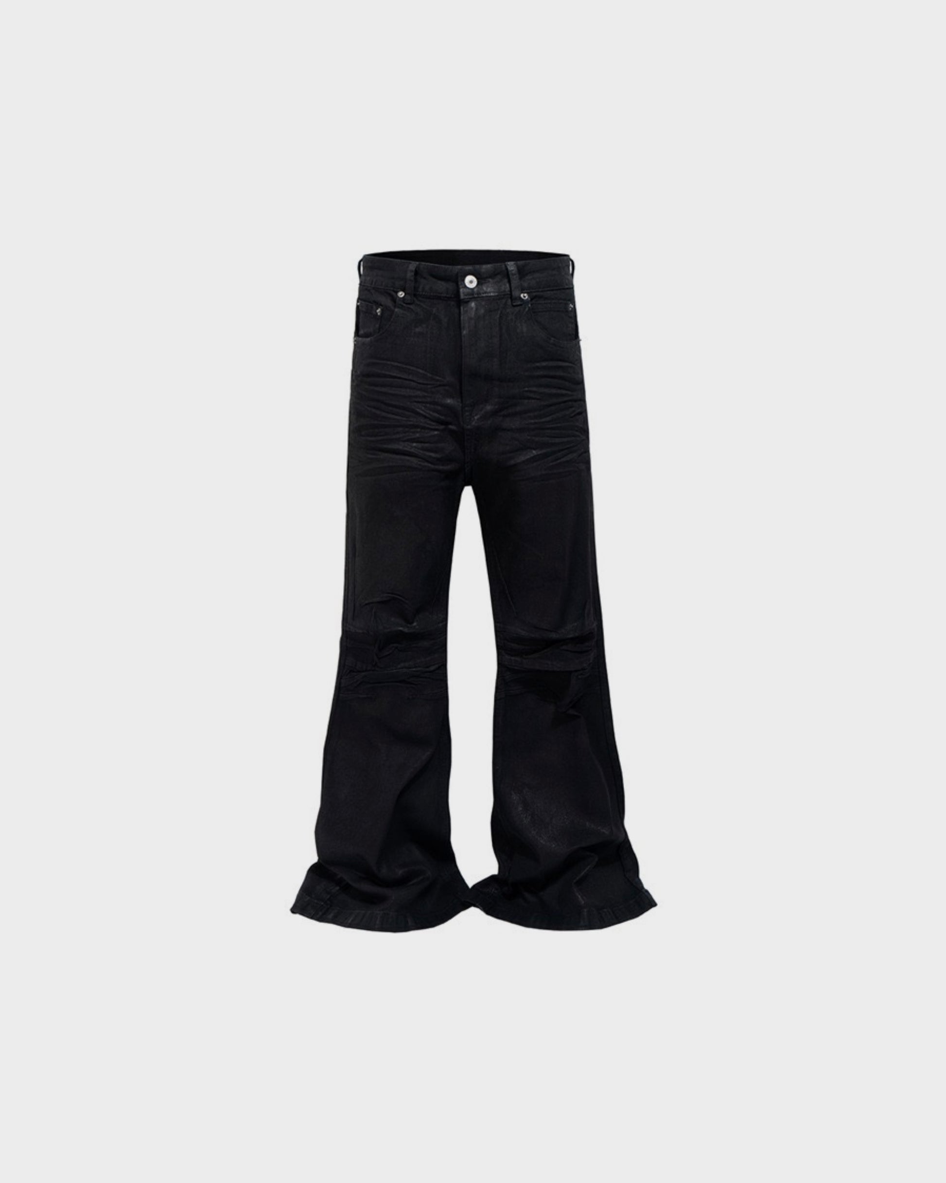 A structured flare denim finished with a subtle wax coating that catches light in motion. The silhouette is built to elongate the legs and add presence — straight through the thigh with a controlled flare through the hem. Slight wrinkling and texture at the knee create depth without effort.