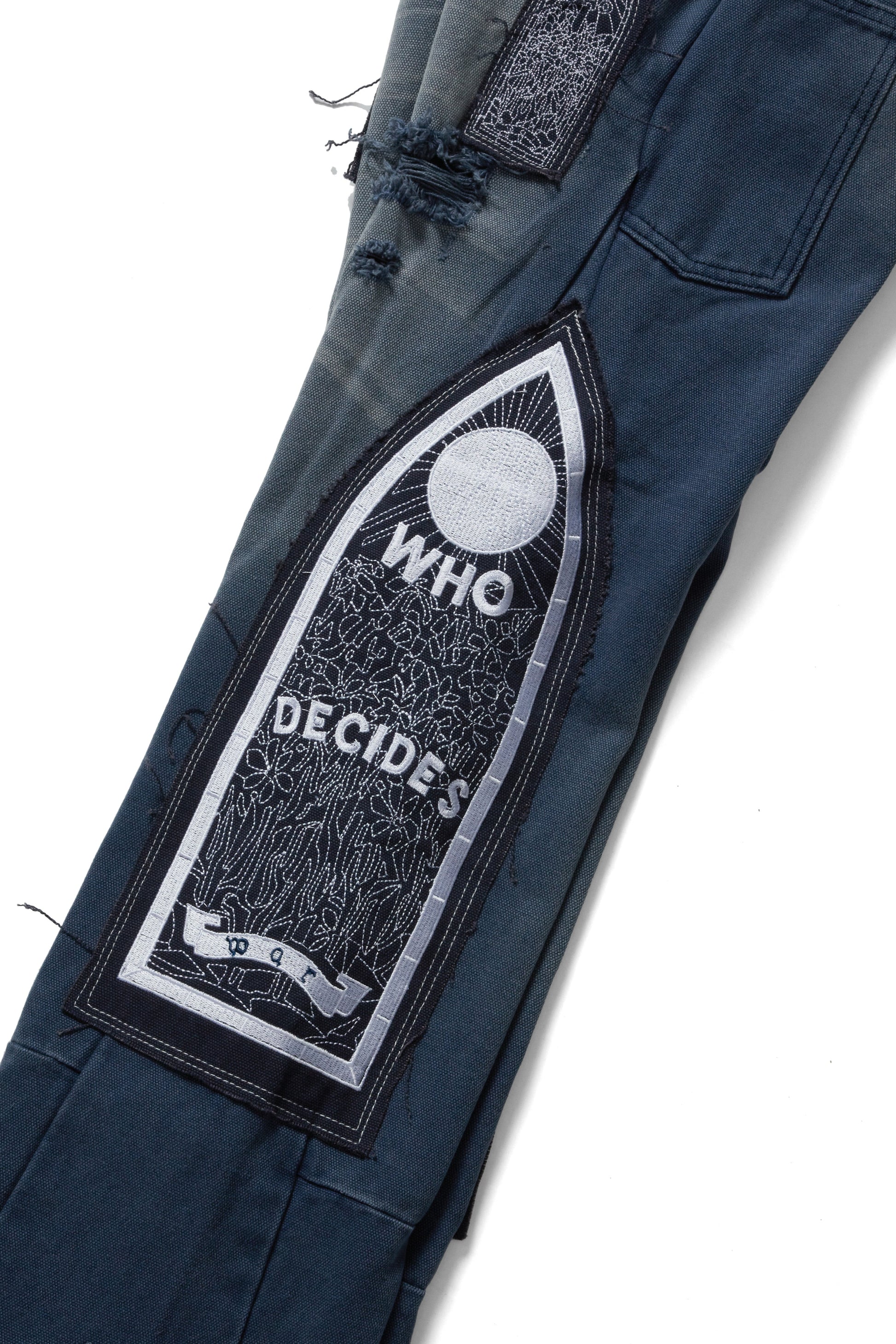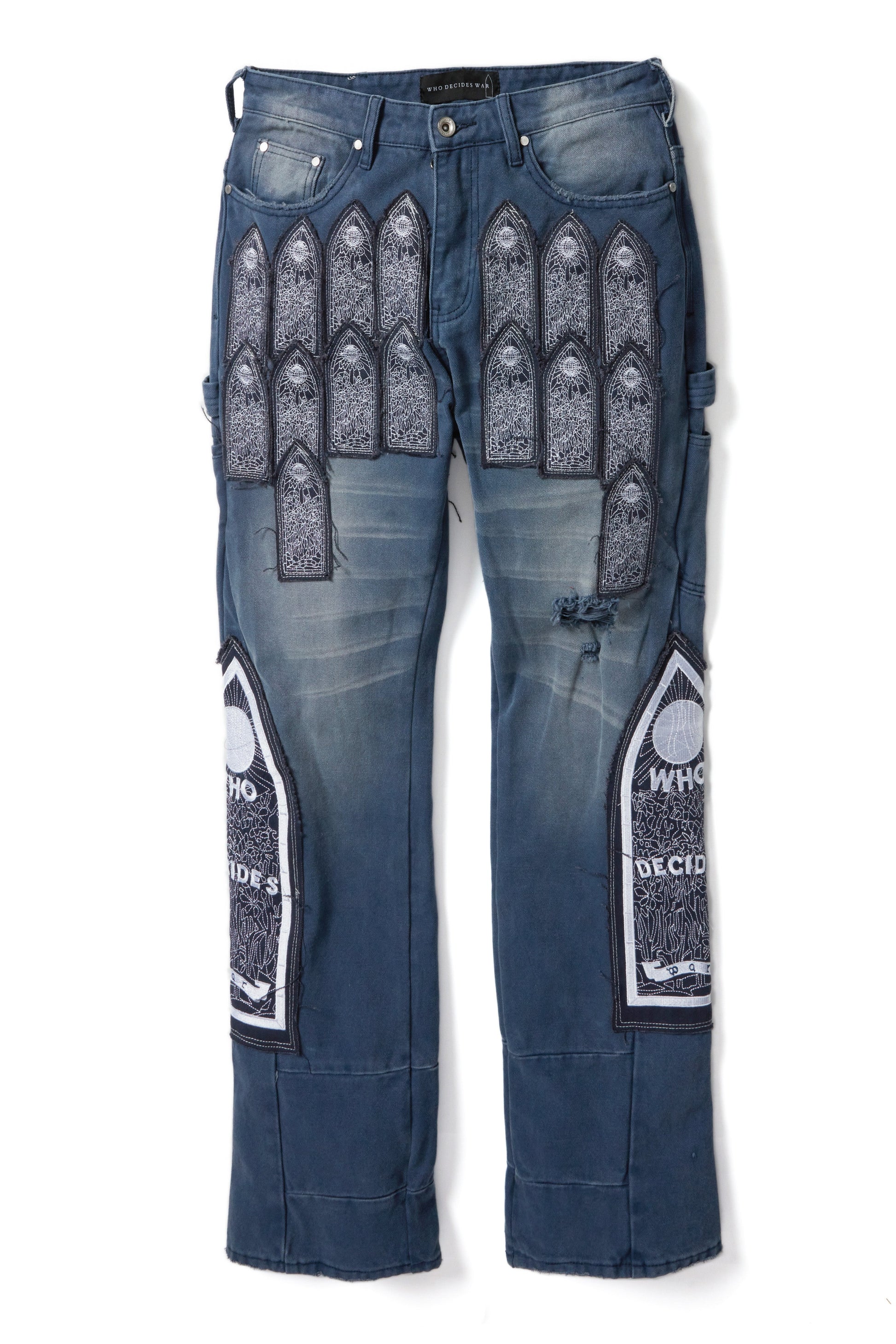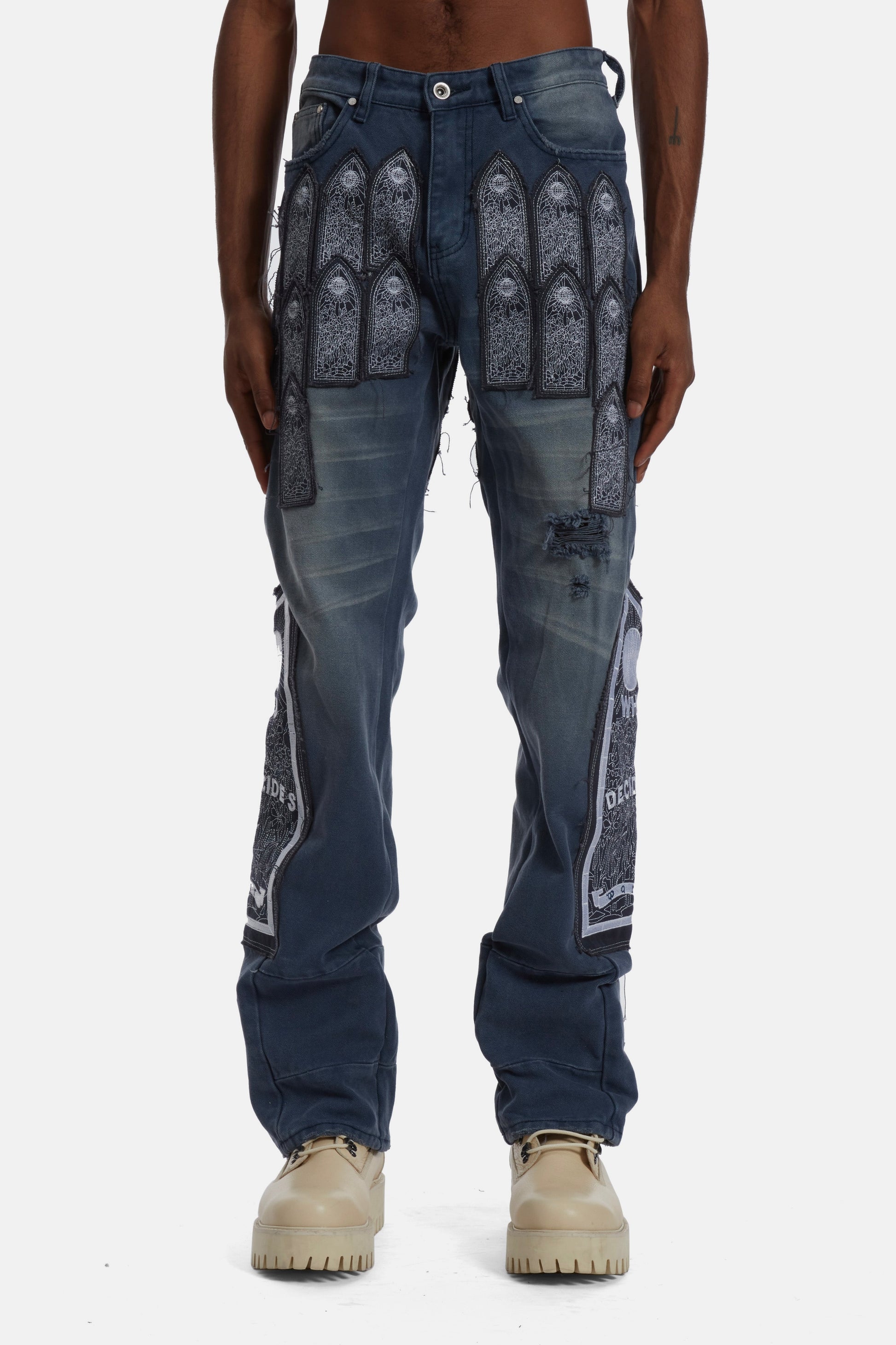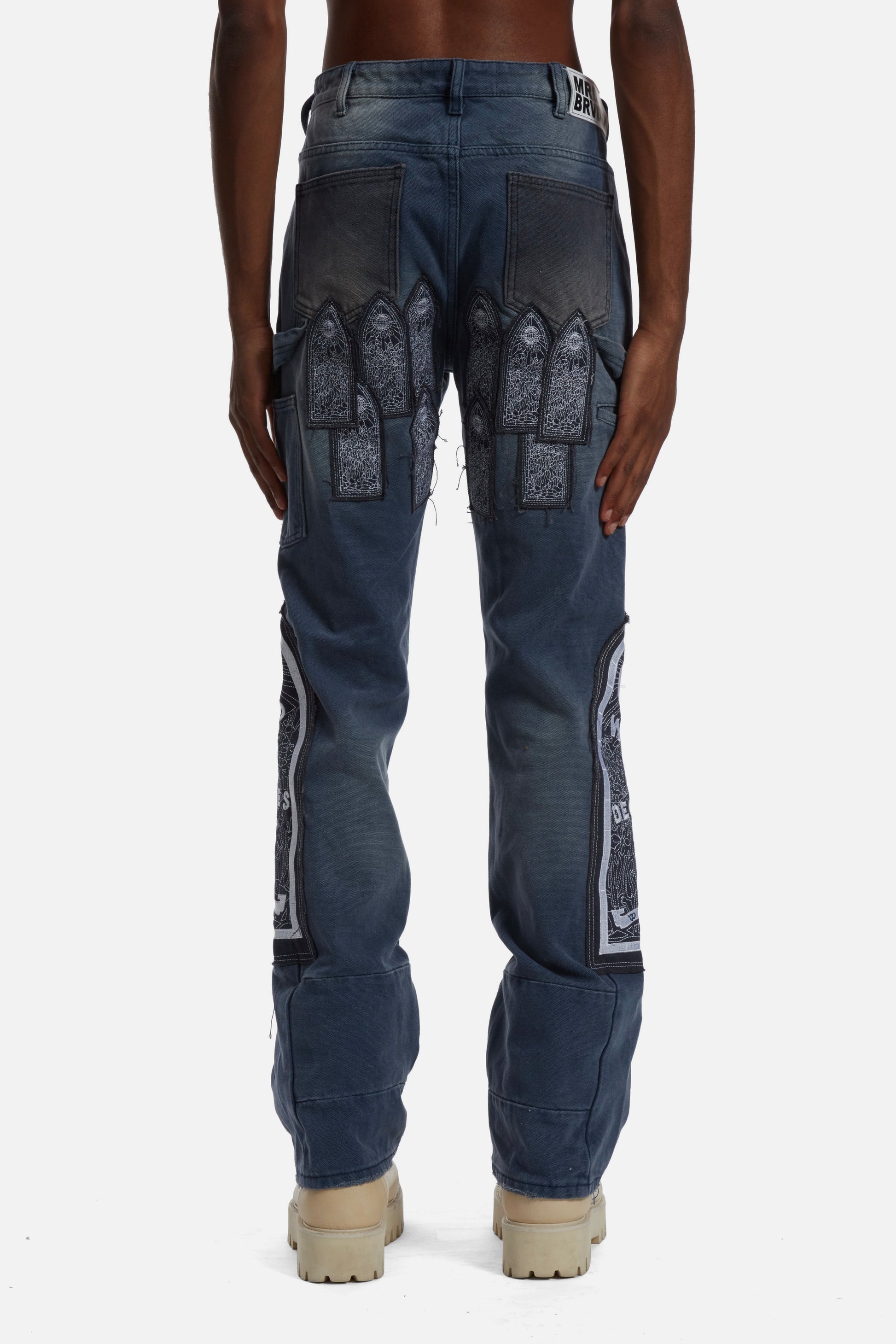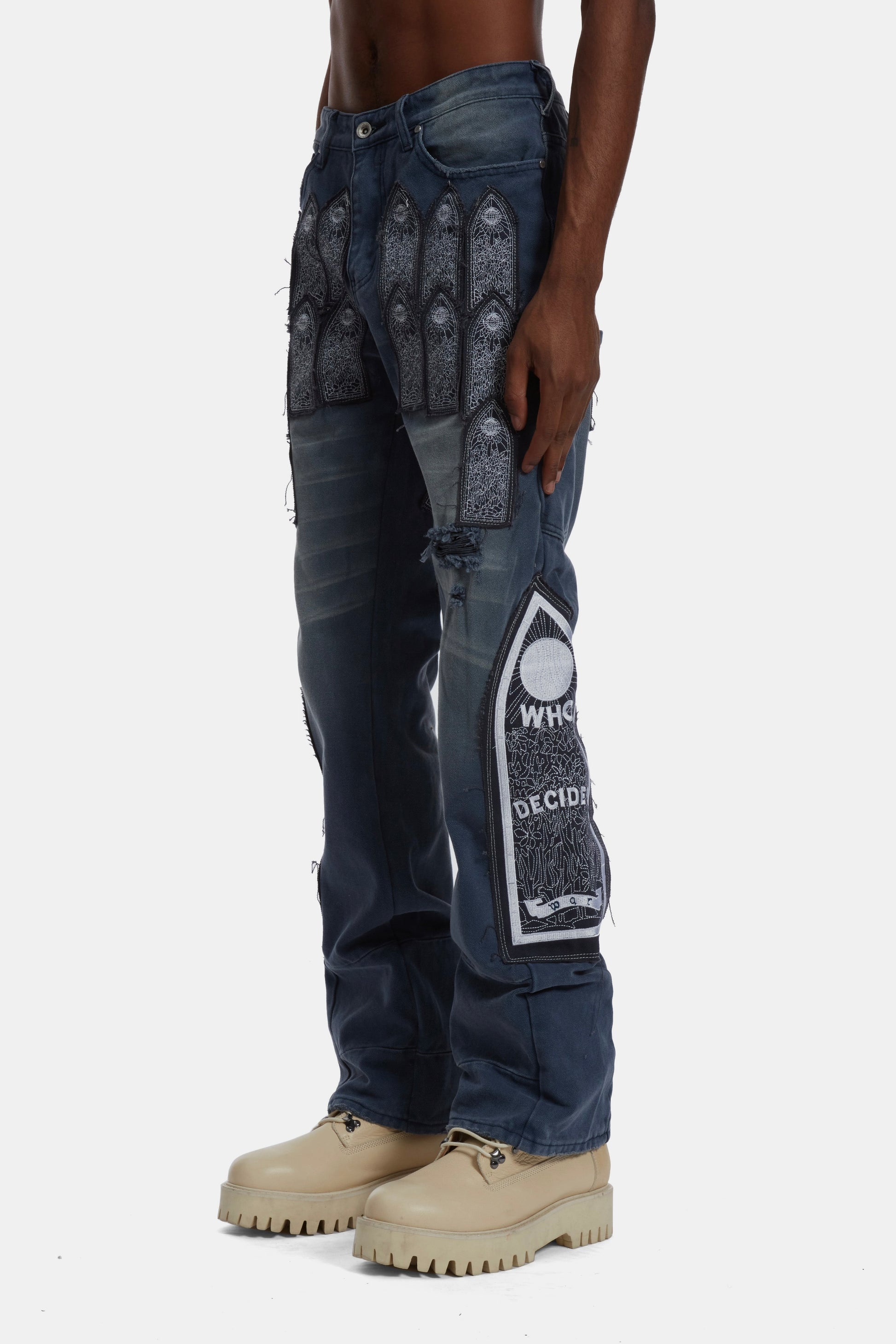 A statement piece blending raw edge with craftsmanship. These navy denim trousers feature signature gothic window patches and distressed detailing, channeling rebellion and artistry in equal measure. Finished with a relaxed fit and stacked silhouette, they’re made to command attention, whether on the street or in the archive.