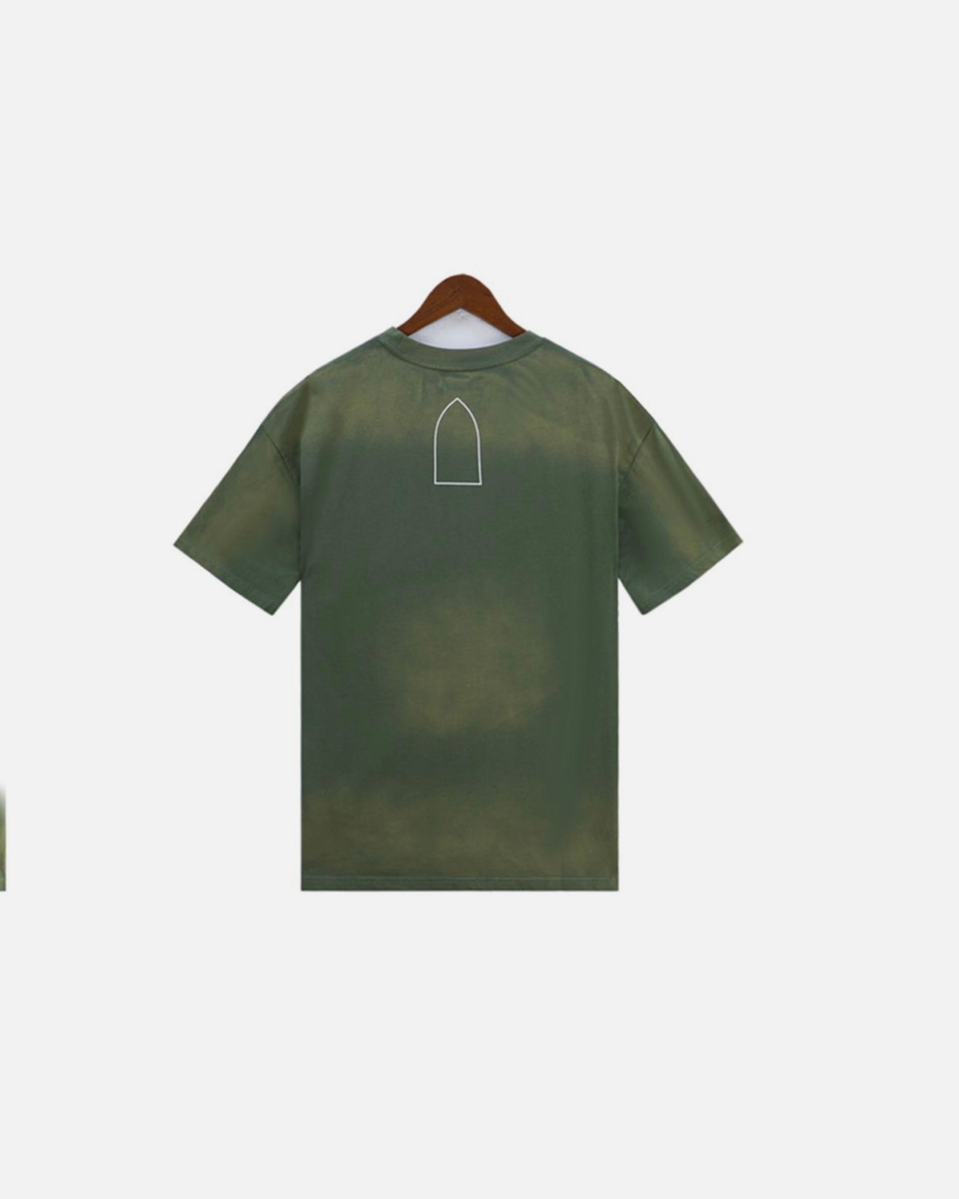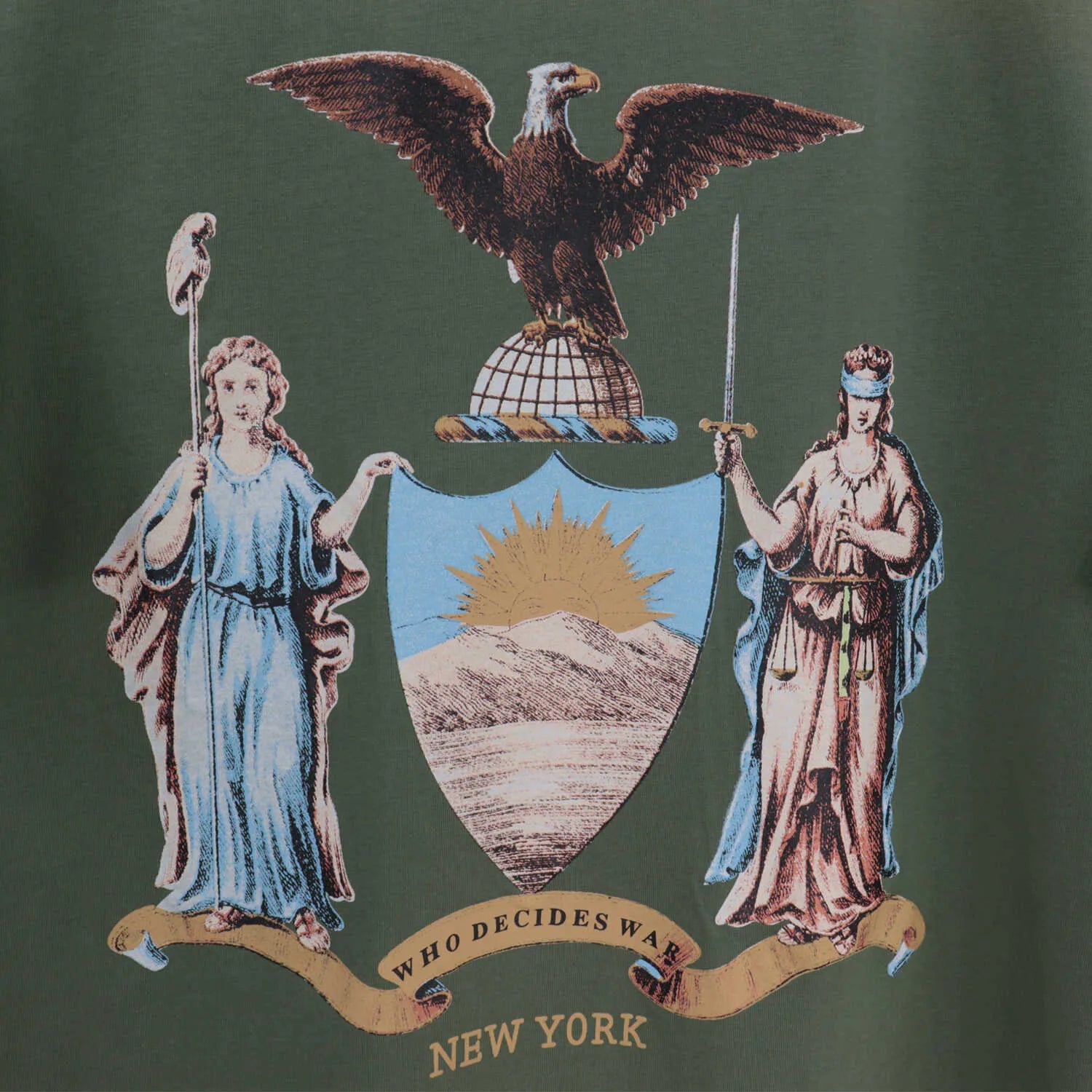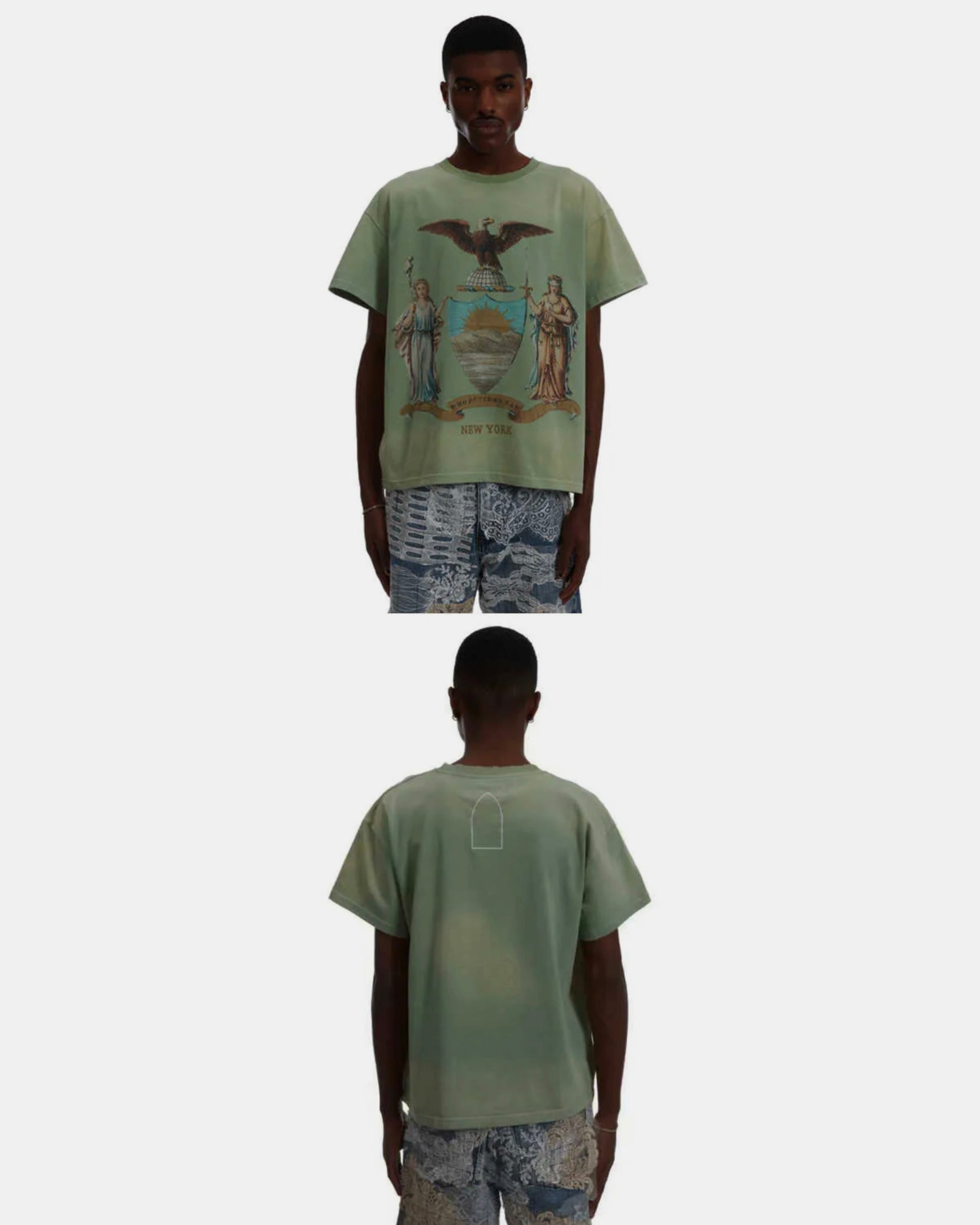 A statement piece that blends vintage grit with emblematic storytelling. The WDW Tee features a bold front print inspired by classic New York state iconography — an eagle in flight, figures of liberty and justice, and a sun rising over calm waters. The washed olive base adds a lived-in patina, giving it the feel of a piece with history.