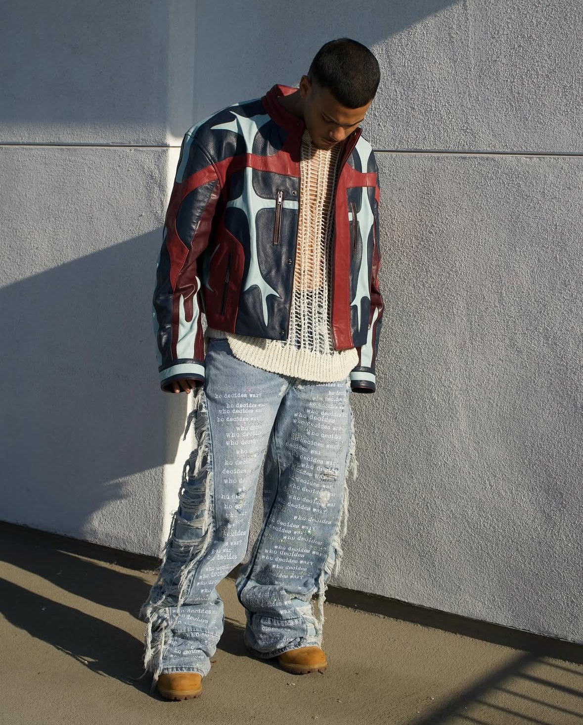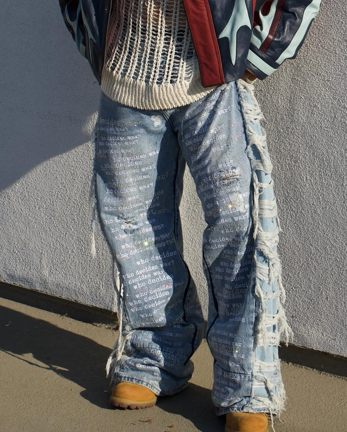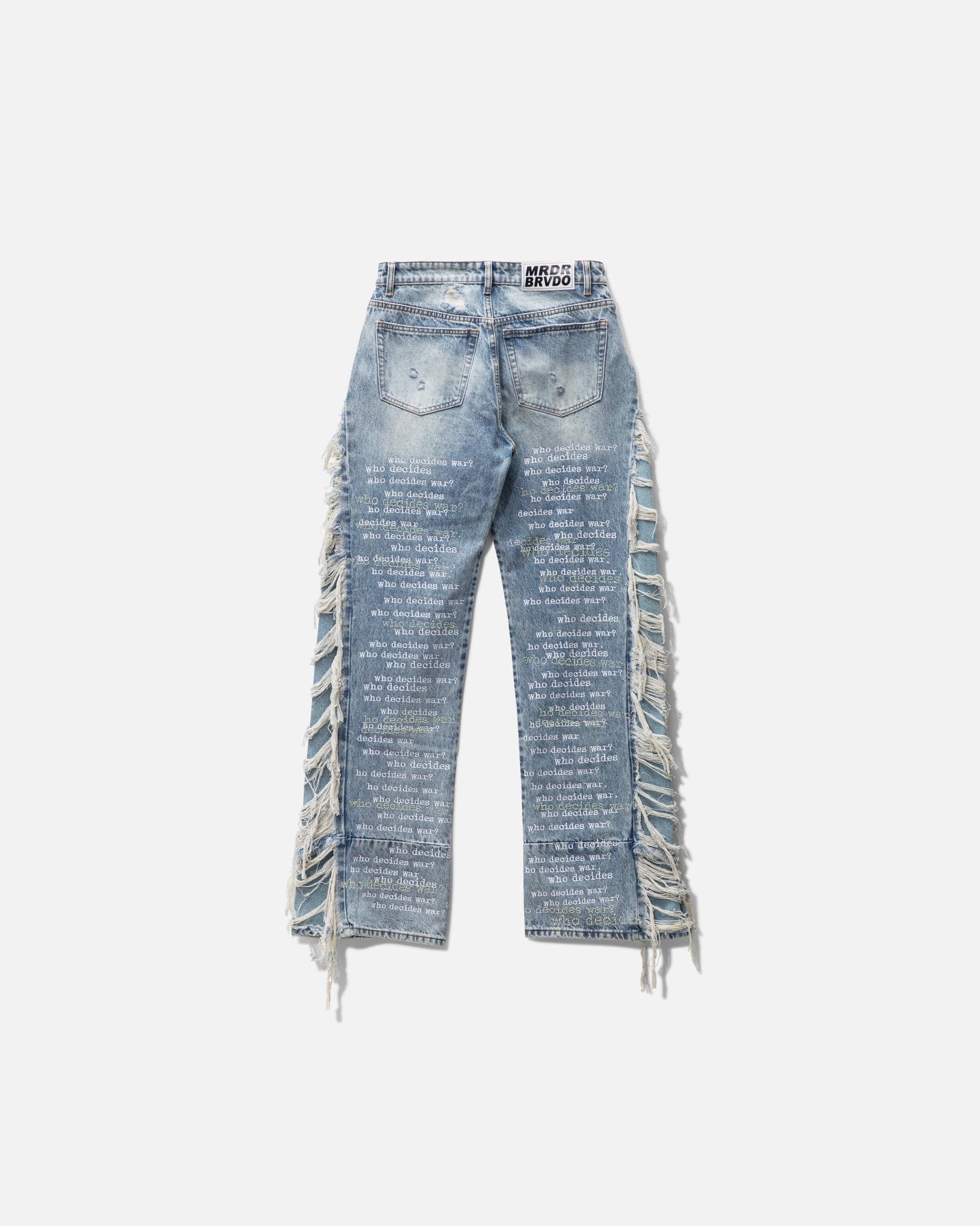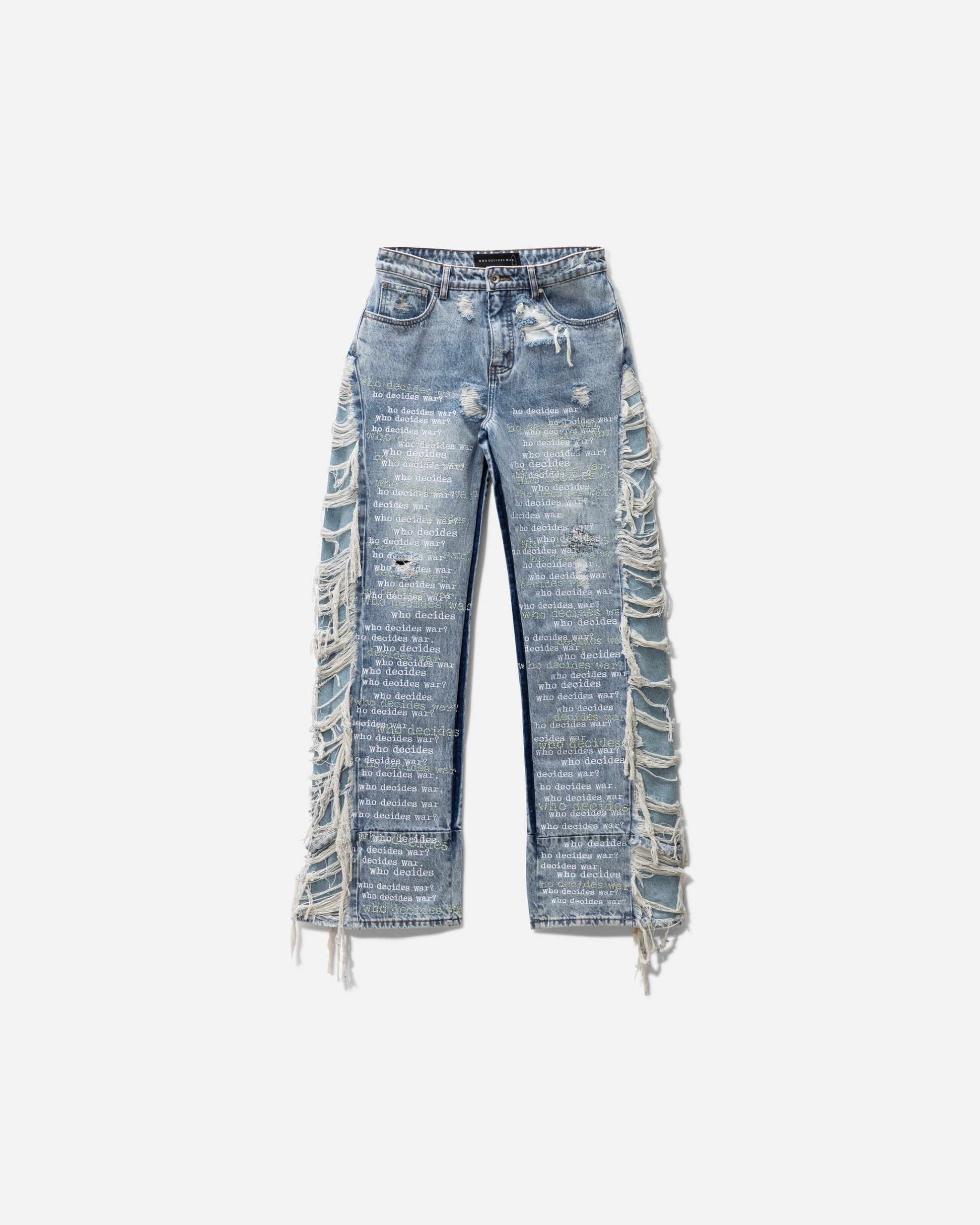 Statement denim from WDW by MURDER BRAVADO. Light-wash cotton denim with the brand’s repeating “WHO DECIDES WAR?” text and dramatic, ladder-distressed side seams that finish in hand-frayed tassels. An exaggerated flare creates stacks and movement with every step—loud, artful, unforgettable.
