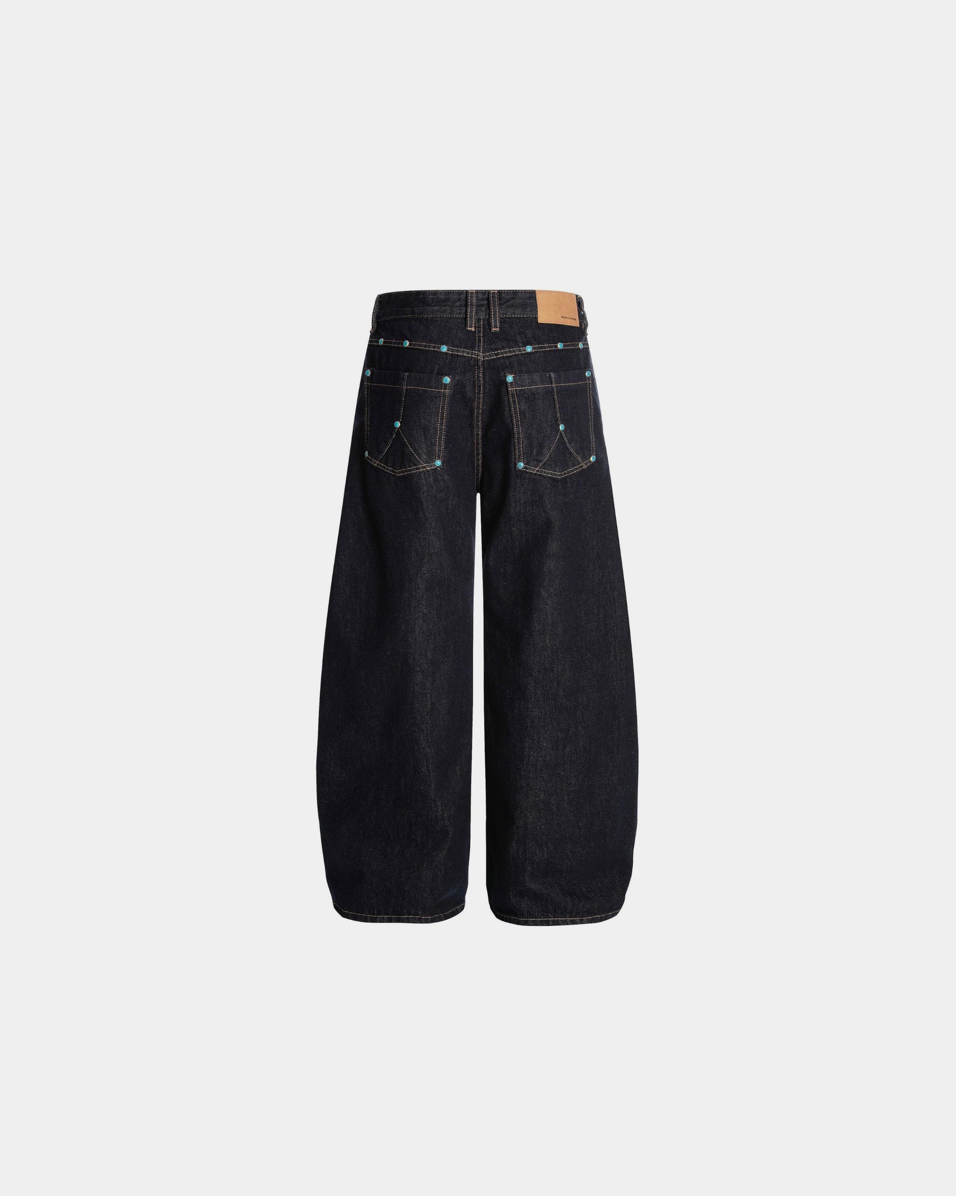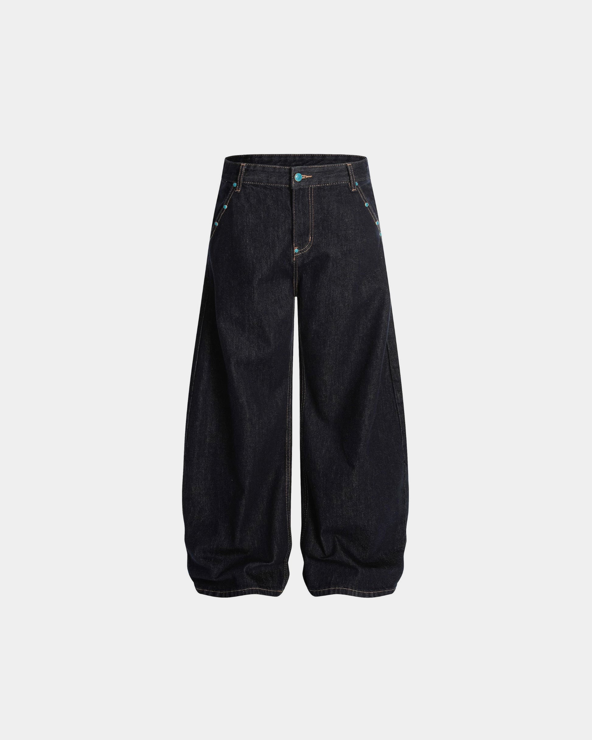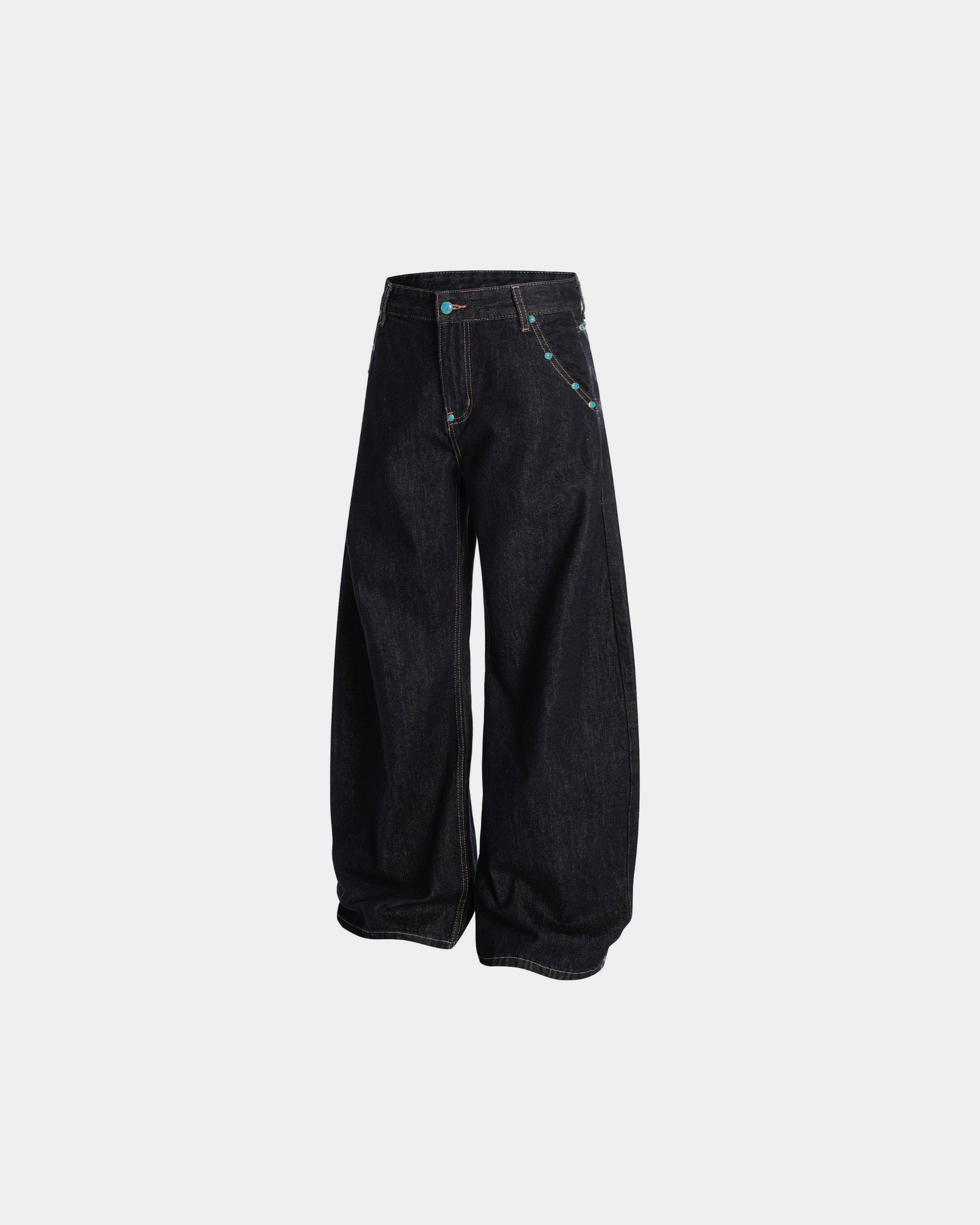Cut from heavyweight indigo denim, these jeans redefine proportion with their ultra-wide leg and relaxed drape. Designed with contrast stitching, turquoise rivet detailing, and a mid-rise waist, they nod to early 2000s street silhouettes while keeping a modern edge. The exaggerated volume creates a bold shape that stacks effortlessly over sneakers, giving them presence with every step. Finished with dual back pockets, a leather brand patch, and reinforced seams for durability.